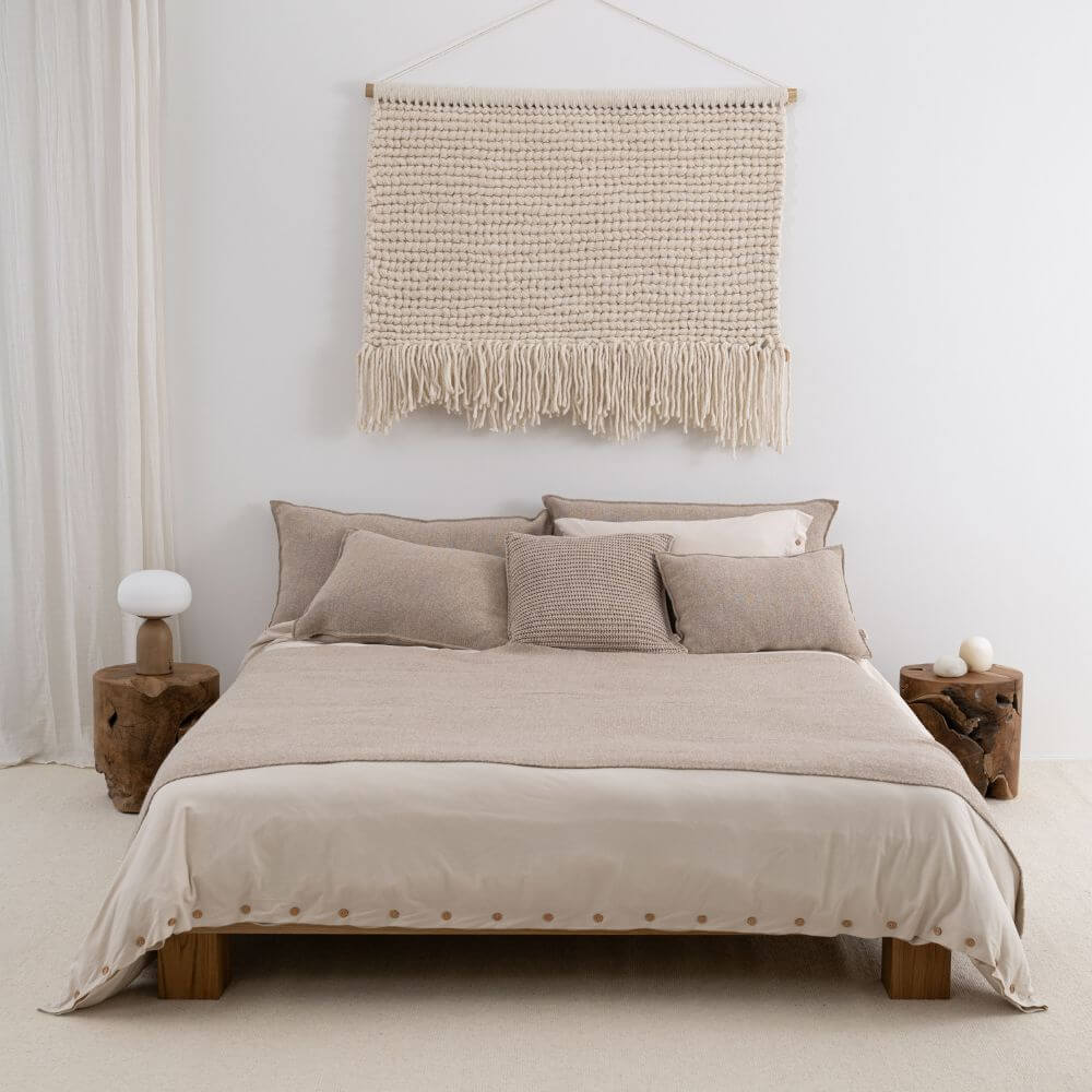 Piękny odcień beżu doskonale komponuje się z gładkimi poduszkami dostępnymi w trzech rozmiarach, pozwalając stworzyć spójną i elegancką aranżację sypialni. Jednocześnie narzuta została zaprojektowana tak, aby swobodnie łączyć ją z tekstyliami o ozdobnym, grubym splocie z tej samej kolekcji. Zestawienie dwóch faktur – subtelnej gładkości i wyrazistej struktury – buduje wielowymiarowy efekt, w którym minimalizm spotyka się z dekoracyjną formą.