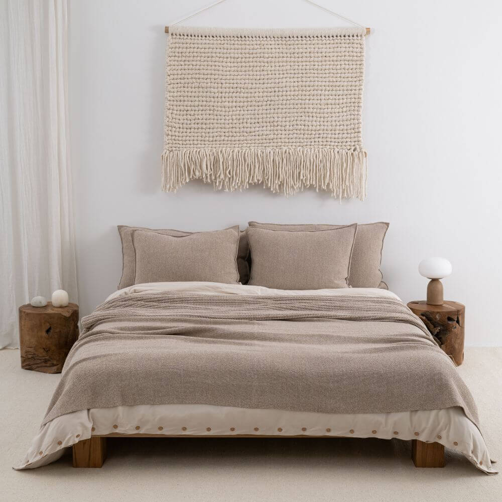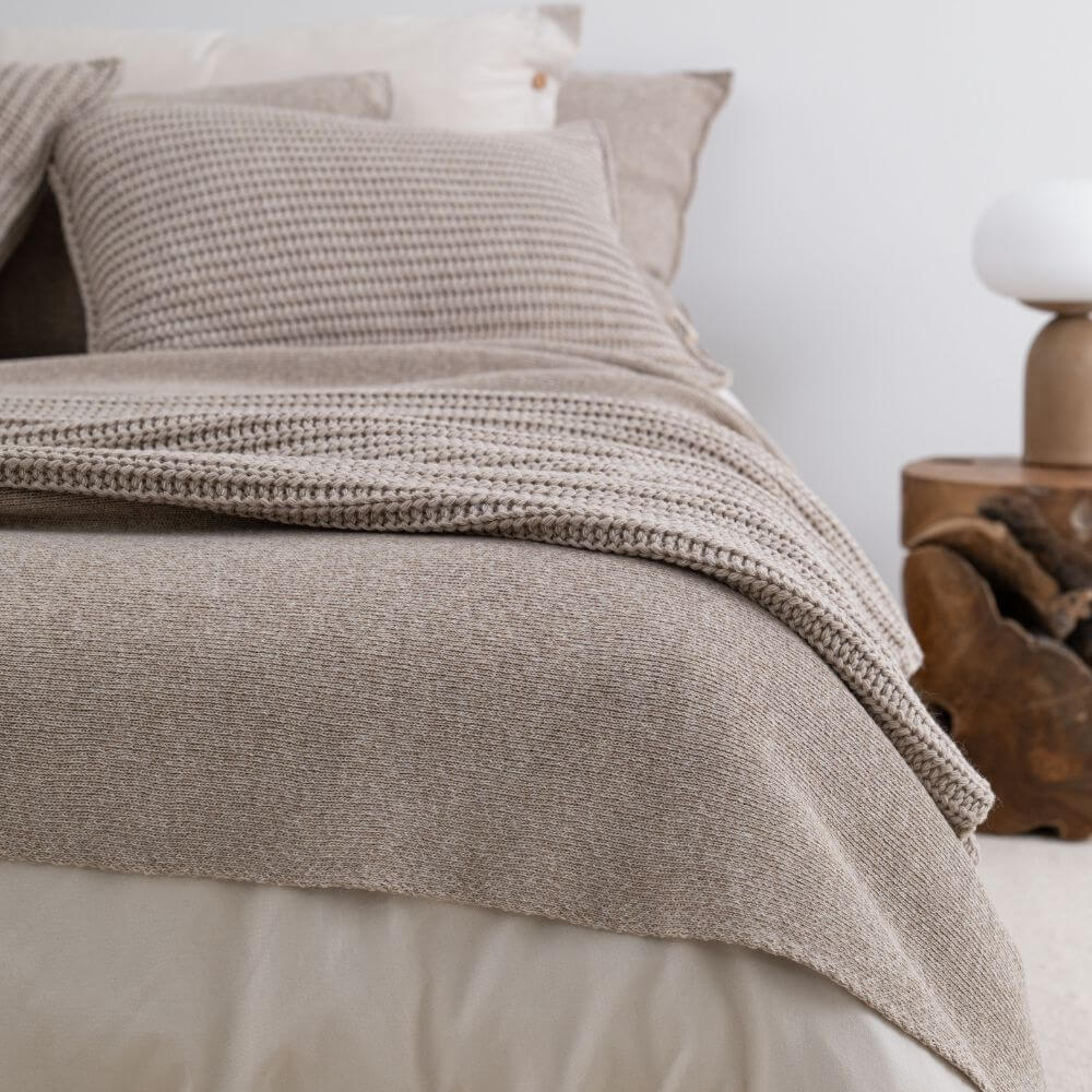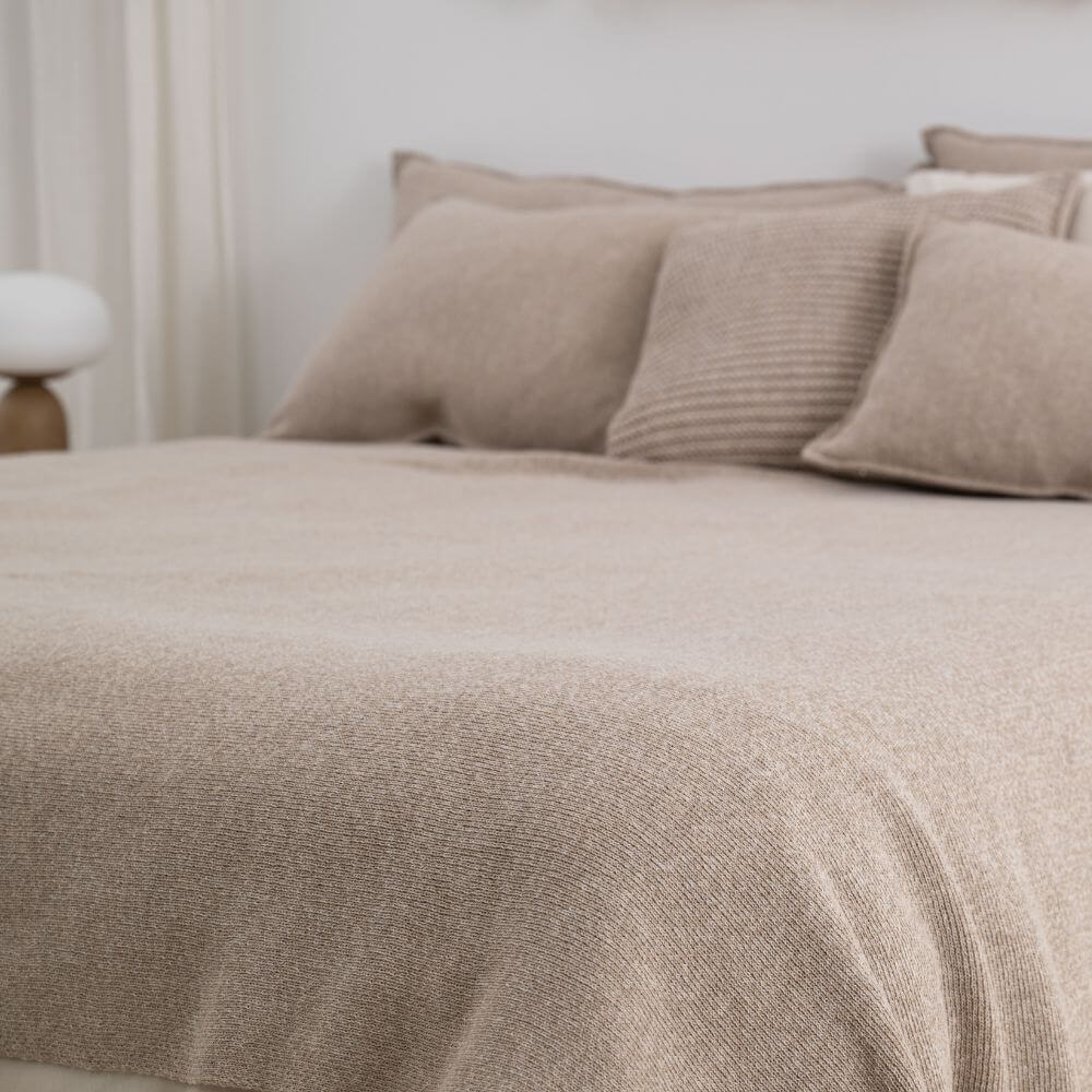 Beżowa narzuta na łóżko z kolekcji Dwa Sploty to esencja spokojnej elegancji i świadomie zaprojektowanej prostoty. Wykonana z mieszanki melanżowej przędzy zachwyca miękkością, trwałością oraz subtelną głębią koloru. Gładziutki, minimalistyczny splot pięknie układa się na łóżku, wprowadzając do wnętrza harmonię i ponadczasowy charakter.