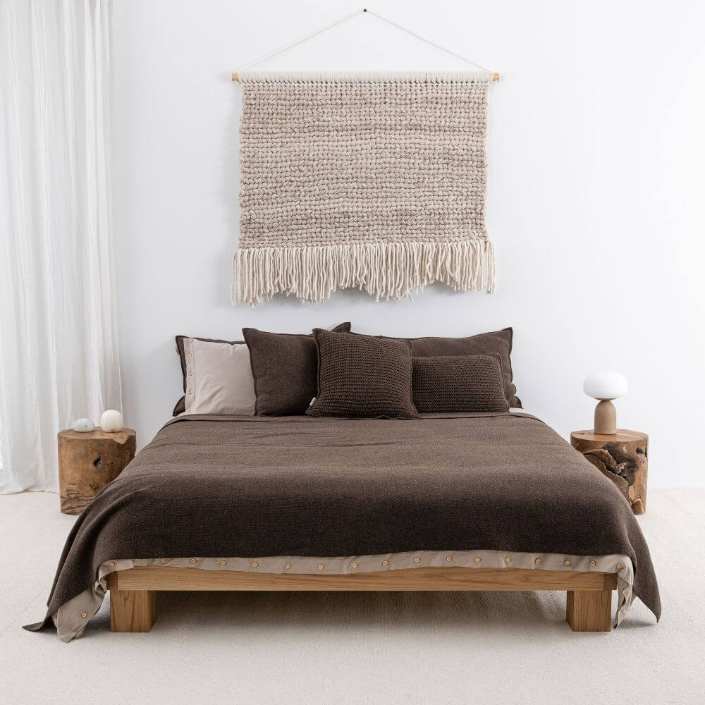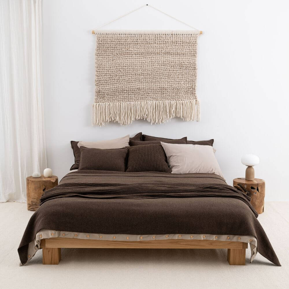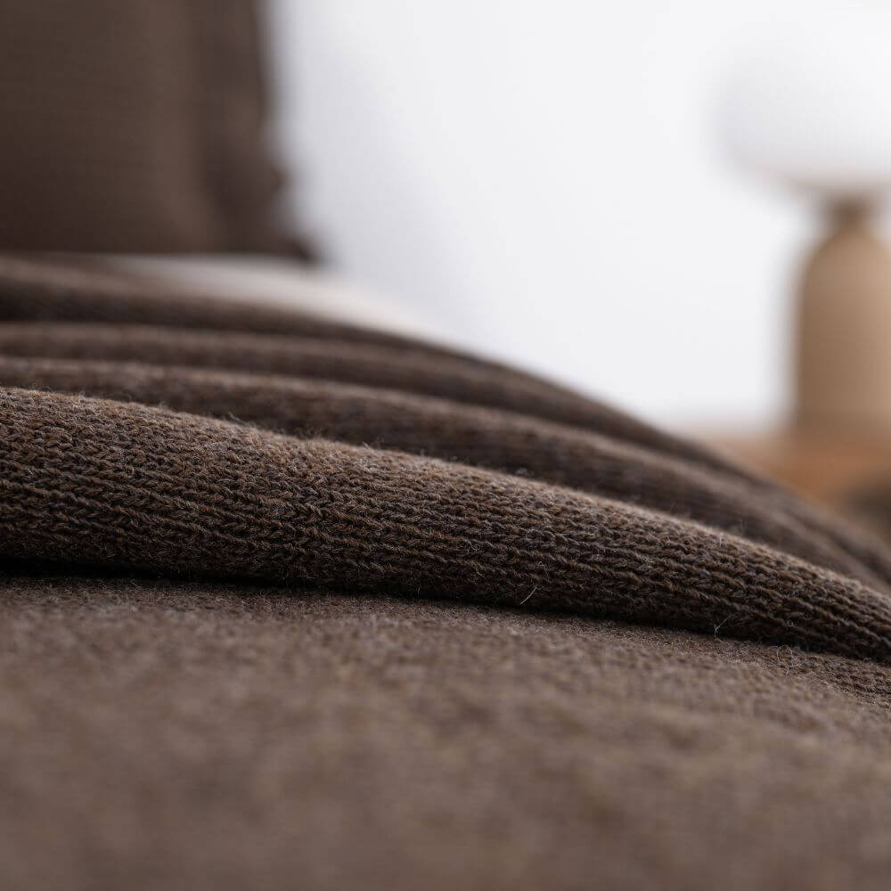 Brązowa narzuta na łóżko z kolekcji Dwa Sploty to esencja spokojnej elegancji i świadomie zaprojektowanej prostoty. Wykonana z mieszanki melanżowej przędzy zachwyca miękkością, trwałością oraz subtelną głębią koloru. Gładziutki, minimalistyczny splot pięknie układa się na łóżku, wprowadzając do wnętrza harmonię i ponadczasowy charakter.
