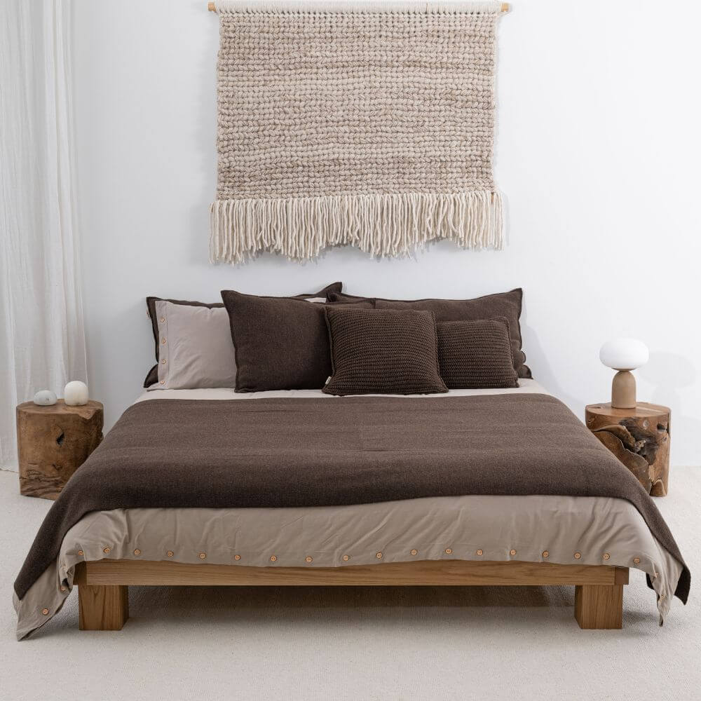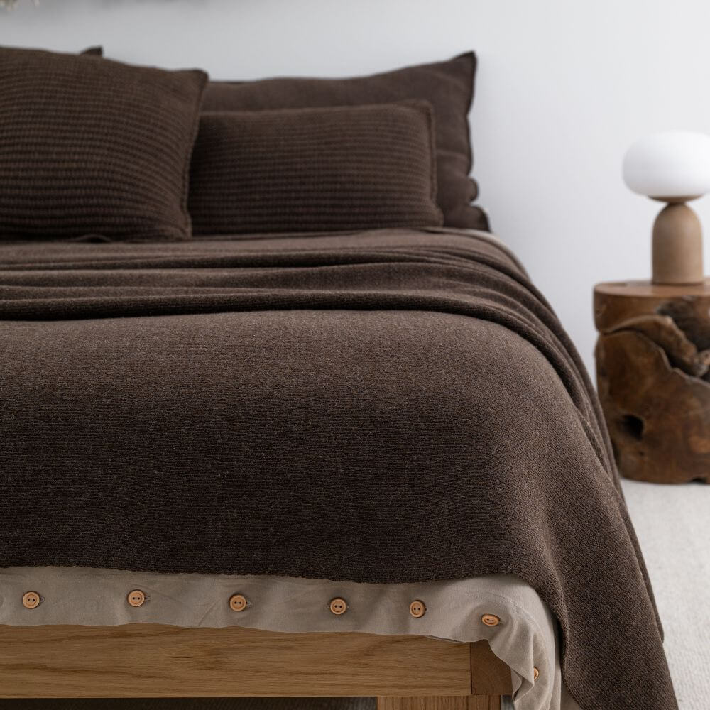 Brązowy kolor, nasz hit sezonu, doskonale komponuje się z gładkimi poszewkami dostępnymi w trzech rozmiarach: 60x40, 70x50 i 90x50 cm, pozwalając stworzyć spójną i elegancką aranżację sypialni. Jednocześnie narzuta została zaprojektowana tak, aby swobodnie łączyć ją z tekstyliami o ozdobnym, grubym splocie z tej samej kolekcji. Zestawienie dwóch faktur – subtelnej gładkości i wyrazistej struktury – buduje wielowymiarowy efekt, w którym minimalizm spotyka się z dekoracyjną formą.