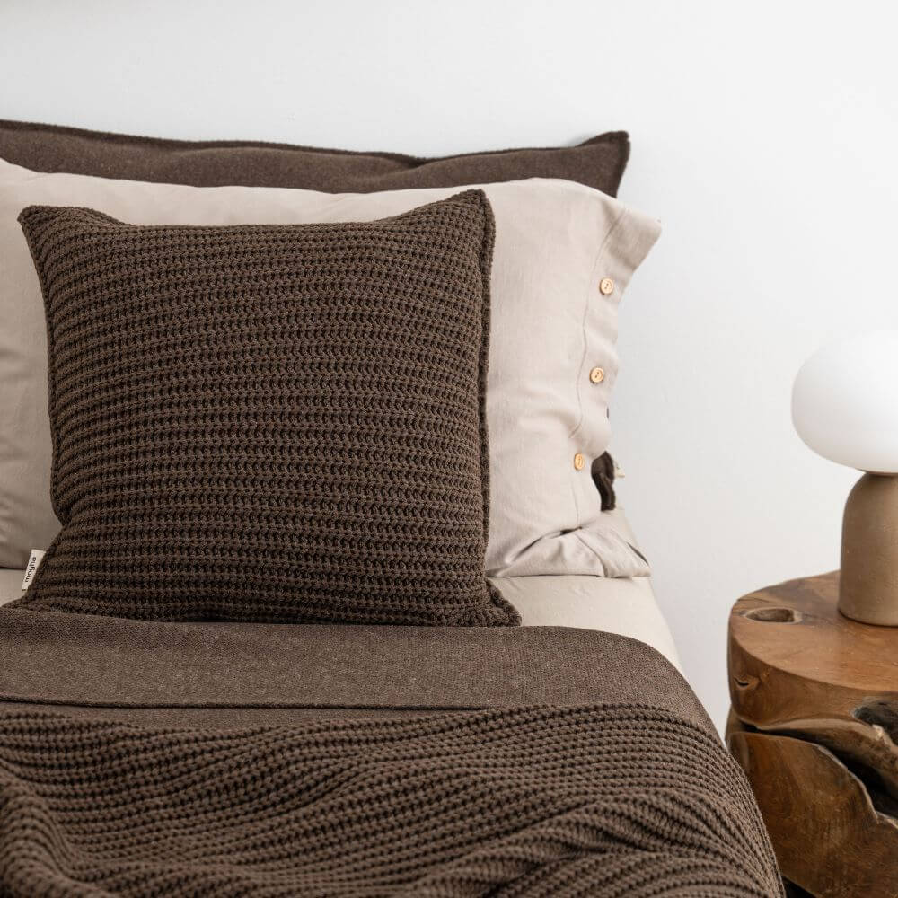 Poszewka w rozmiarze 50×50 cm została zaprojektowana tak, aby tworzyć idealny duet z pledem w tym samym splocie lub gładką narzutą na łóżko, tworząc spójną i elegancką kompozycję. Dzięki swojej dekoracyjnej strukturze świetnie komponuje się również z gładkimi tekstyliami z tej samej kolekcji. Zestawienie poszewki z wyrazistą strukturą splotu i gładkich produktów pozwala budować wielowymiarową aranżację, w której minimalizm spotyka się z dekoracyjną fakturą.