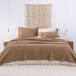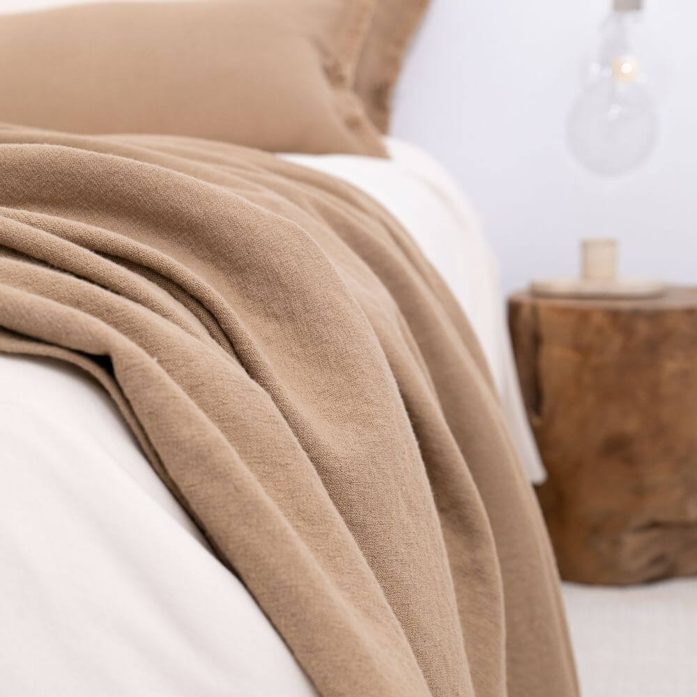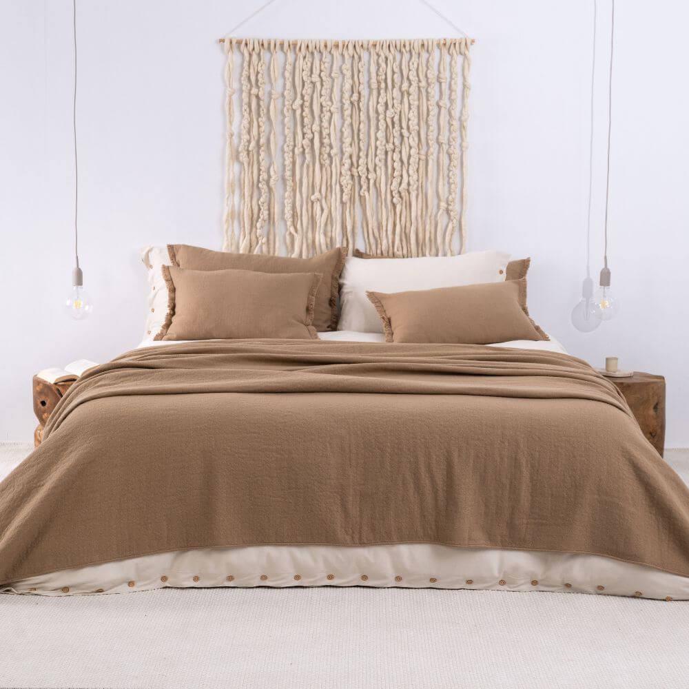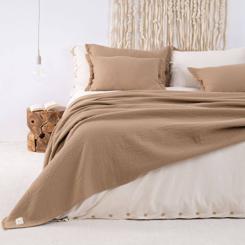 Narzuta na łóżko w pięknym, jasnobrązowym kolorze to świetna opcja dla prawdziwych miłośników ciepłej wełny. Narzuta ma gładki kolor i delikatnie karbowaną fakturę splotu. O zaletach wełnianych produktów pisać nie trzeba, ale warto podkreślić jej naturalny i ciepły charakter, szczególnie doceniany w zimniejszych porach roku. Jeśli więc lubisz spędzać czas również na pościelonym łóżku i zdarza Ci się uciąć sobie popołudniową drzemkę, narzuta z wełny będzie przy okazji wspaniałym i ciepłym okryciem. Świetny skład -100% wełny, piękny jasnobrązowy odcień i ozdobny brzeg narzuty, to czysta klasyka doceniana przez koneserów, która długo się nie znudzi. Narzuta ma trzy rozmiary do wyboru. Popularny wymiar 240x240 cm pasuje na łóżka z materacem 160x200 cm lub 180x200 cm. Większa narzuta 240x260 cm idealnie przykrywa łóżko aż do ziemi. Możesz wybrać też najmniejszy rozmiar 130x240 cm, który przykrywa tylko część łóżka, na której zazwyczaj przysiadamy. Wybierz idealny rozmiar narzuty dla siebie i dobierz do niej naszą jednokolorową pościel z jerseyu, kilka poszewek dekoracyjnych w komplecie z tej samej kolekcji i Twoja sypialnia będzie gotowa na nadejście zimy!