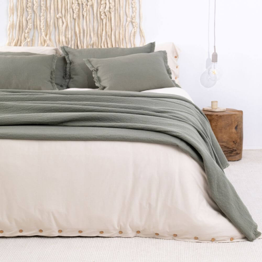 Narzuta na łóżko w pięknym, oliwkowym kolorze to świetna opcja dla prawdziwych miłośników ciepłej wełny. Narzuta ma gładki kolor i delikatnie karbowaną fakturę splotu. O zaletach wełnianych produktów pisać nie trzeba, ale warto podkreślić jej naturalny i ciepły charakter, szczególnie doceniany w zimniejszych porach roku. Jeśli więc lubisz spędzać czas również na pościelonym łóżku i zdarza Ci się uciąć sobie popołudniową drzemkę, narzuta z wełny będzie przy okazji wspaniałym i ciepłym okryciem. Świetny skład- 100% wełny, delikatny oliwkowy kolor i ozdobny brzeg narzuty, to czysta klasyka doceniana przez koneserów, która długo się nie znudzi. Narzuta ma trzy rozmiary do wyboru. Popularny wymiar 240x240 cm pasuje na łóżka z materacem 160x200 cm lub 180x200 cm. Większa narzuta 240x260 cm idealnie przykrywa łóżko aż do ziemi. Możesz wybrać też najmniejszy rozmiar 130x240 cm, który przykrywa tylko część łóżka, na której zazwyczaj przysiadamy. Wybierz idealny rozmiar narzuty dla siebie i dobierz do niej białą lub beżową, jednokolorową pościel z jerseyu, kilka poszewek dekoracyjnych w komplecie z tej samej kolekcji i Twoja sypialnia będzie gotowa na nadejście zimy!