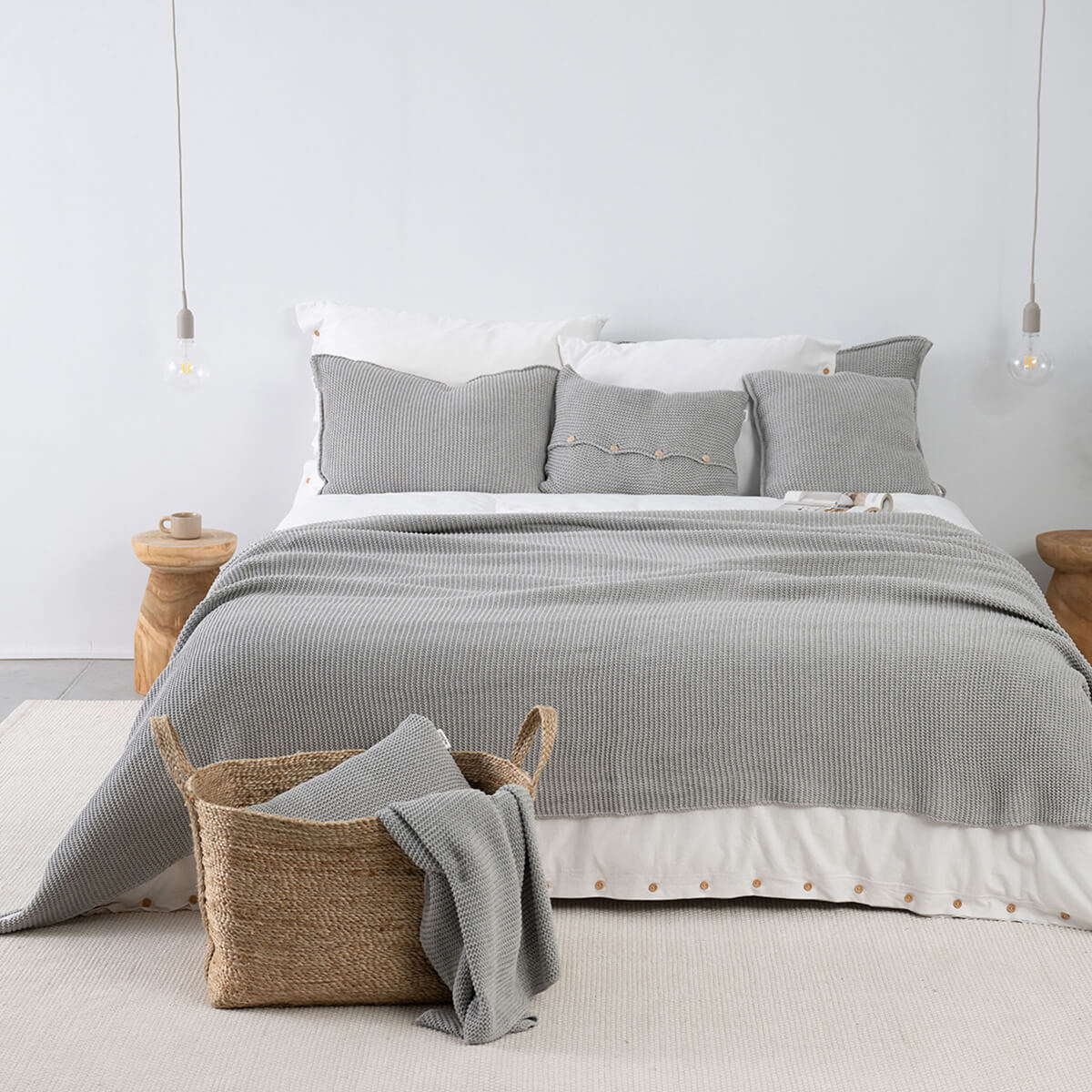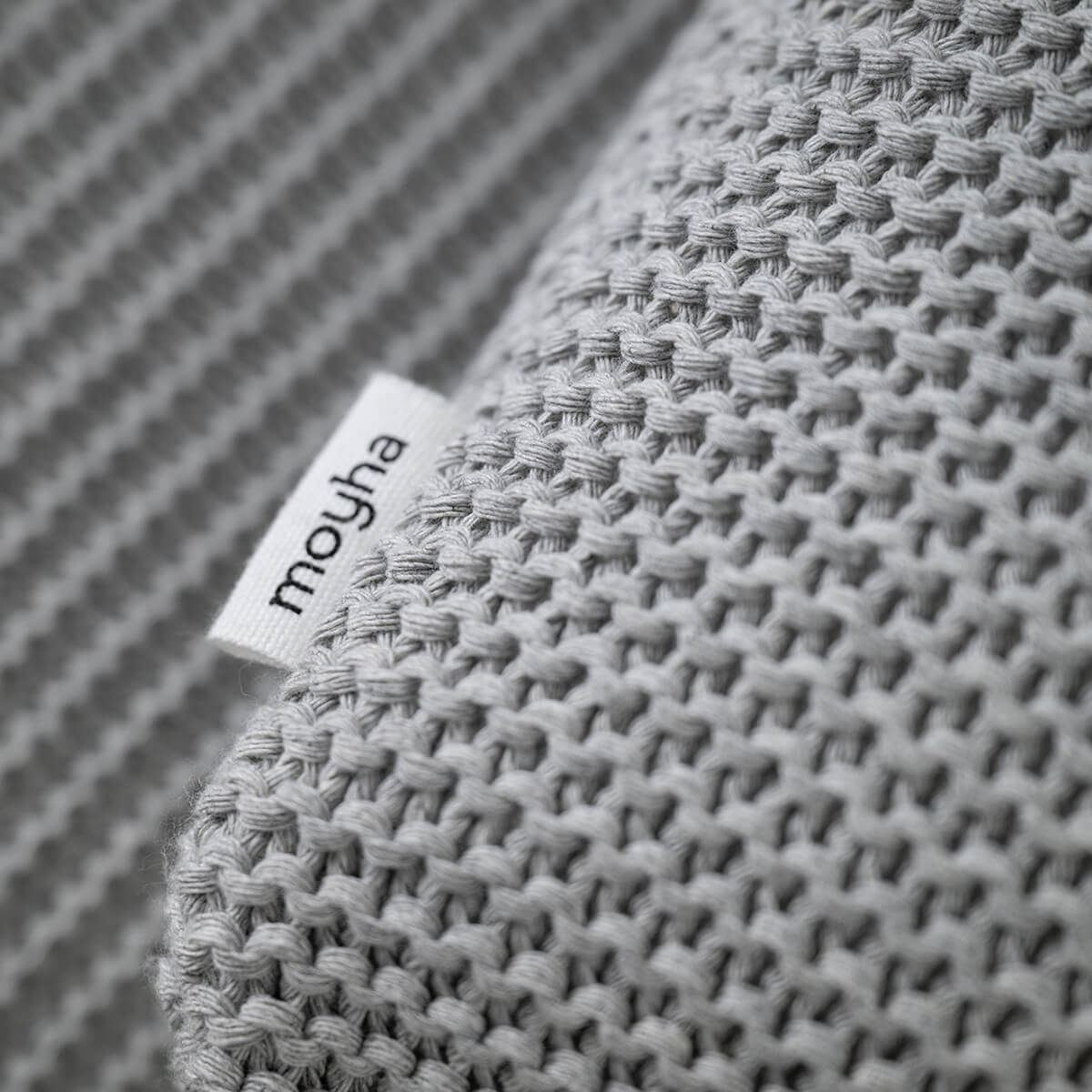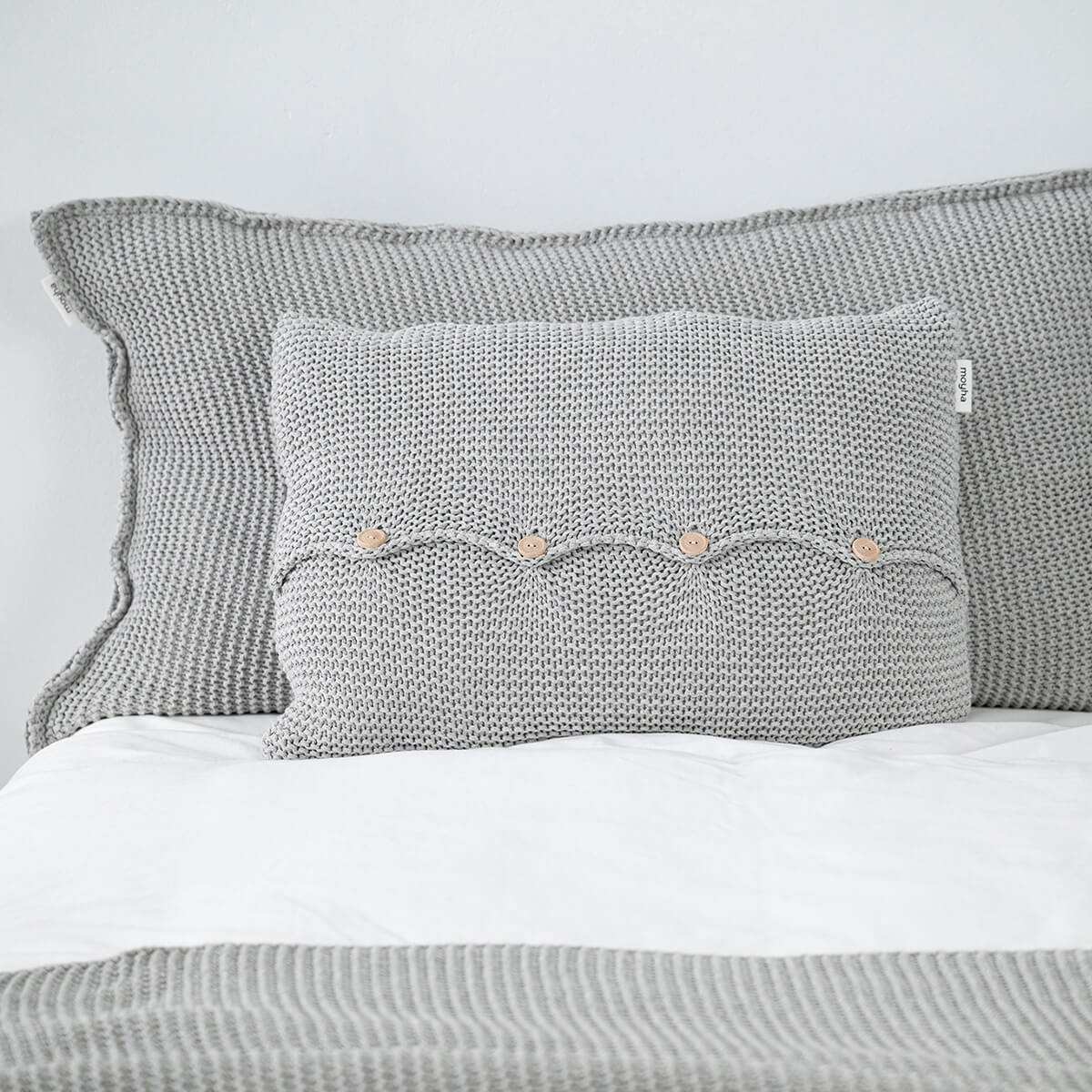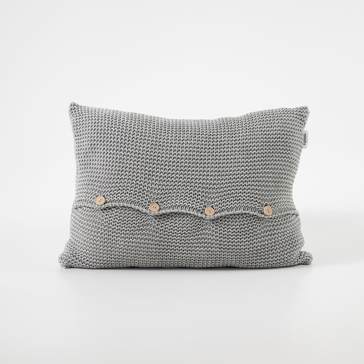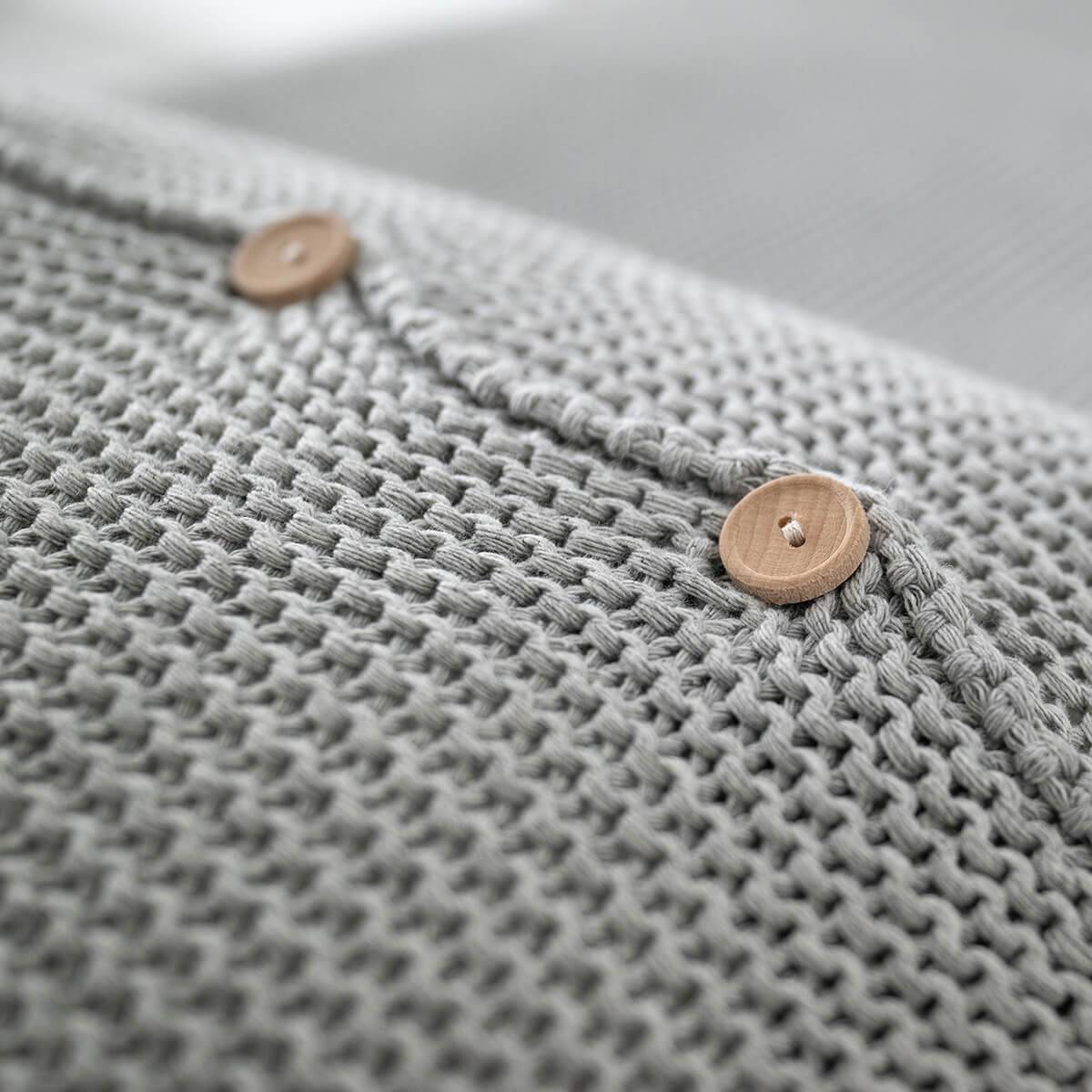 Poszewka z guzikami w jasnoszarym kolorze ma prosty, mięsisty wzór i wykonana jest z mieszanki bawełnianej przędzy całkowicie pochodzącej z recyklingu. To dla nas ważny aspekt wyboru przędzy do tej kolekcji. Ozdobą poszewki są guziki zrobione z drewna bukowego. Można je wyeksponować lub odwrócić chowając do tyłu. Poduszka wygląda najpiękniej w zestawie, kiedy łączymy ją z pledem, narzutą lub innymi poduszkami z tej samej kolekcji. Beżowy i jasnoszary kolor to propozycja do wnętrz naturalnych. Nadaję się również do stylizacji w stylu boho.