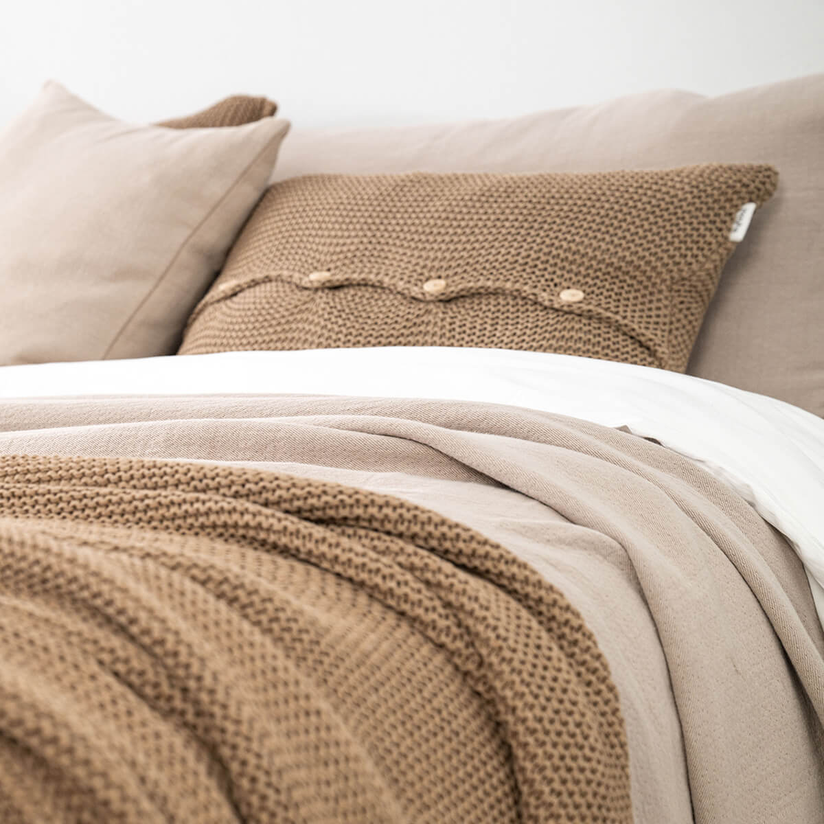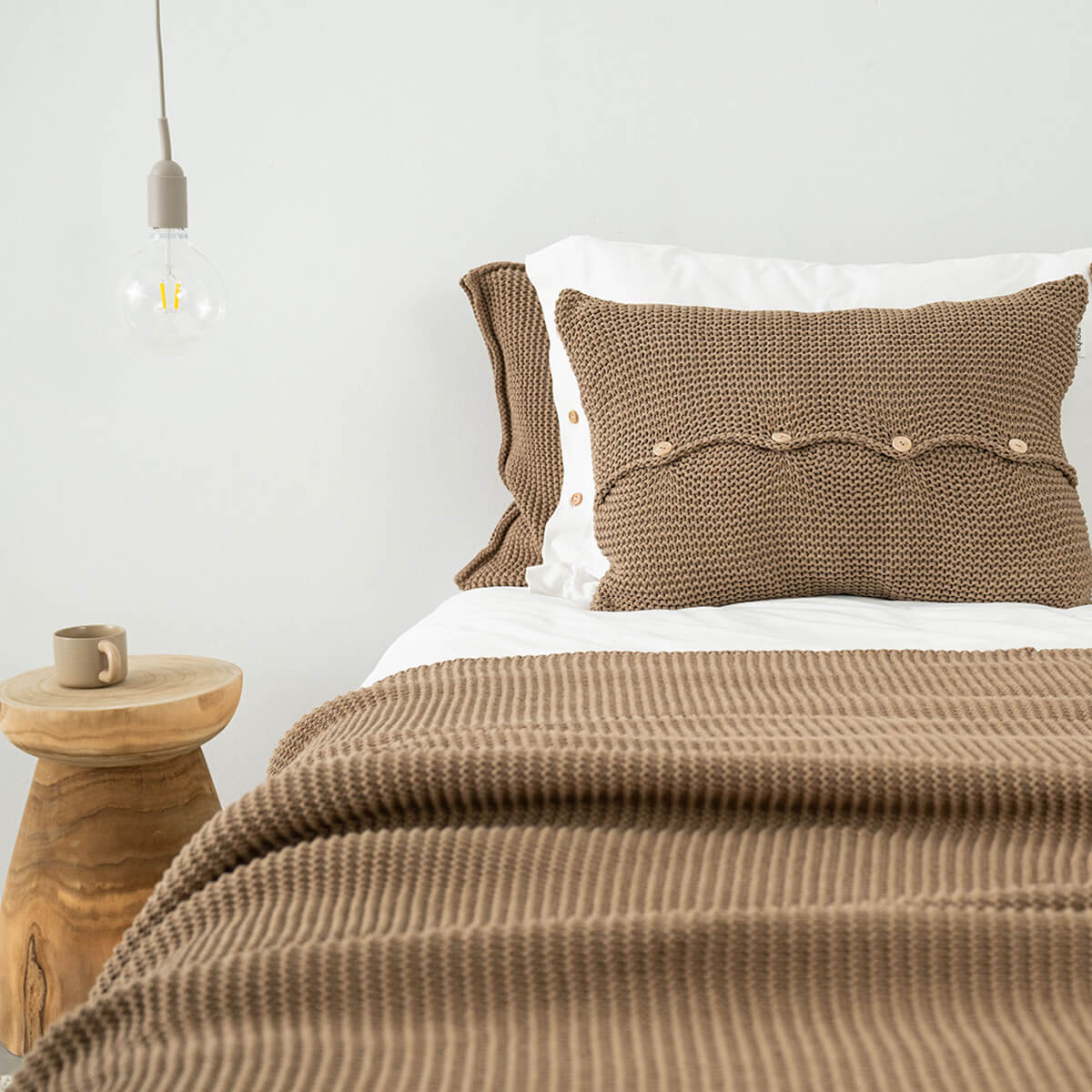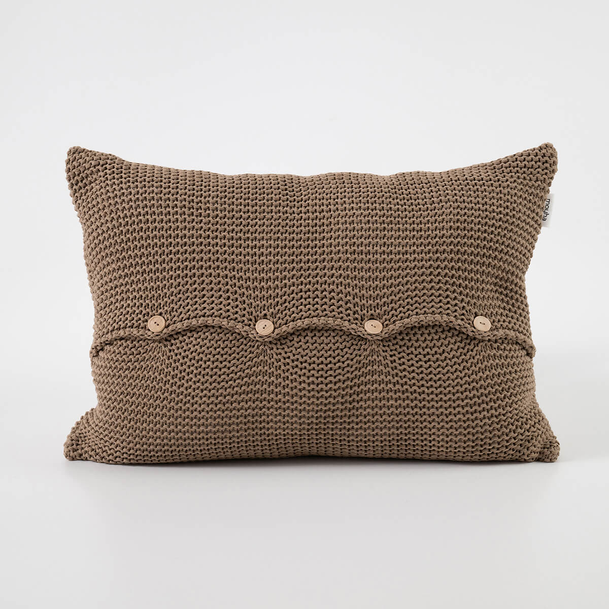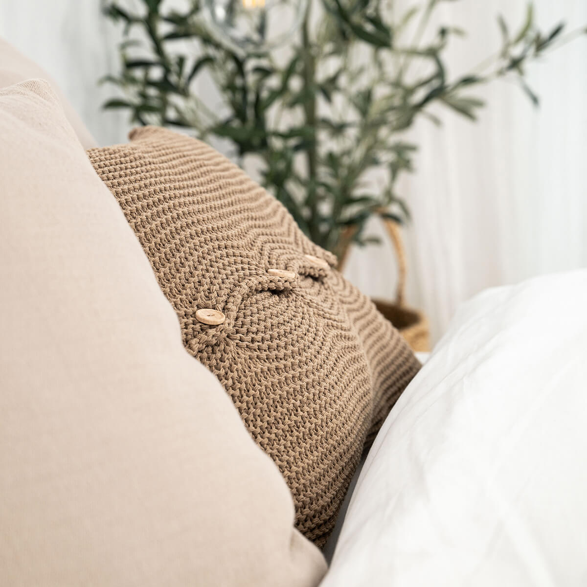 Poszewka z guzikami w odcieniu jasnobrązowym to nasza nowość! Ta poszewka dekoracyjna ma prosty, mięsisty wzór i wykonana jest z mieszanki bawełnianej przędzy całkowicie pochodzącej z recyklingu. Ozdobą poszewki są guziki zrobione z drewna bukowego. Można je, wedle uznania, wyeksponować lub odwrócić chowając do tyłu. Poduszka wygląda najpiękniej w zestawie, kiedy łączymy ją z pledem, narzutą lub innymi poduszkami z tej samej kolekcji. Tekstylia z tej kolekcji nadają się również do stylizacji w stylu boho.