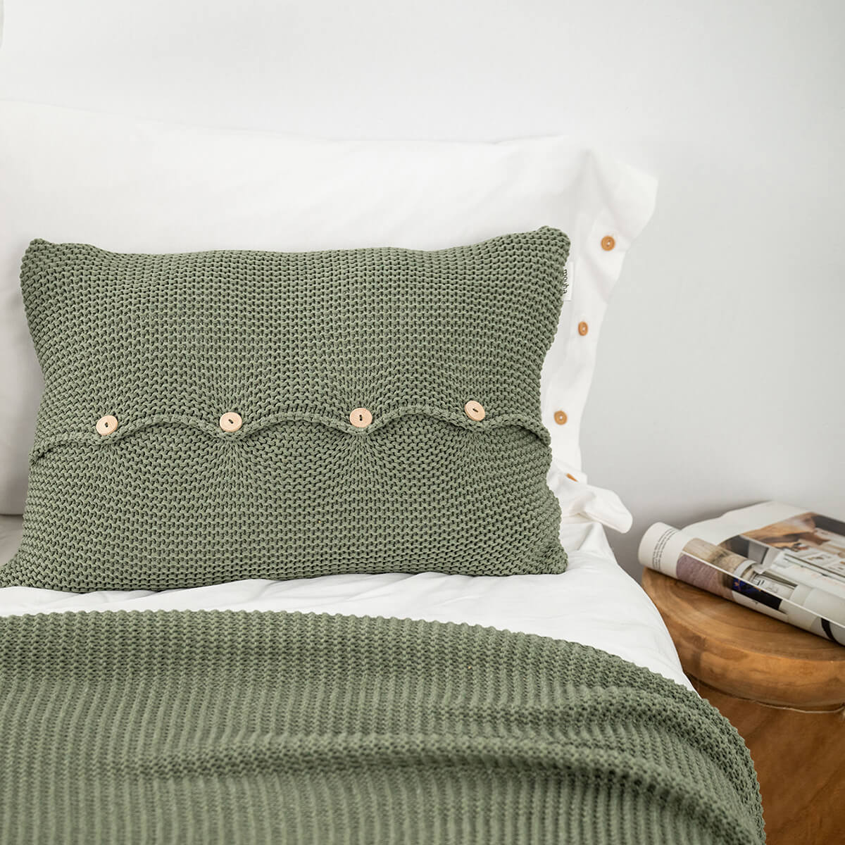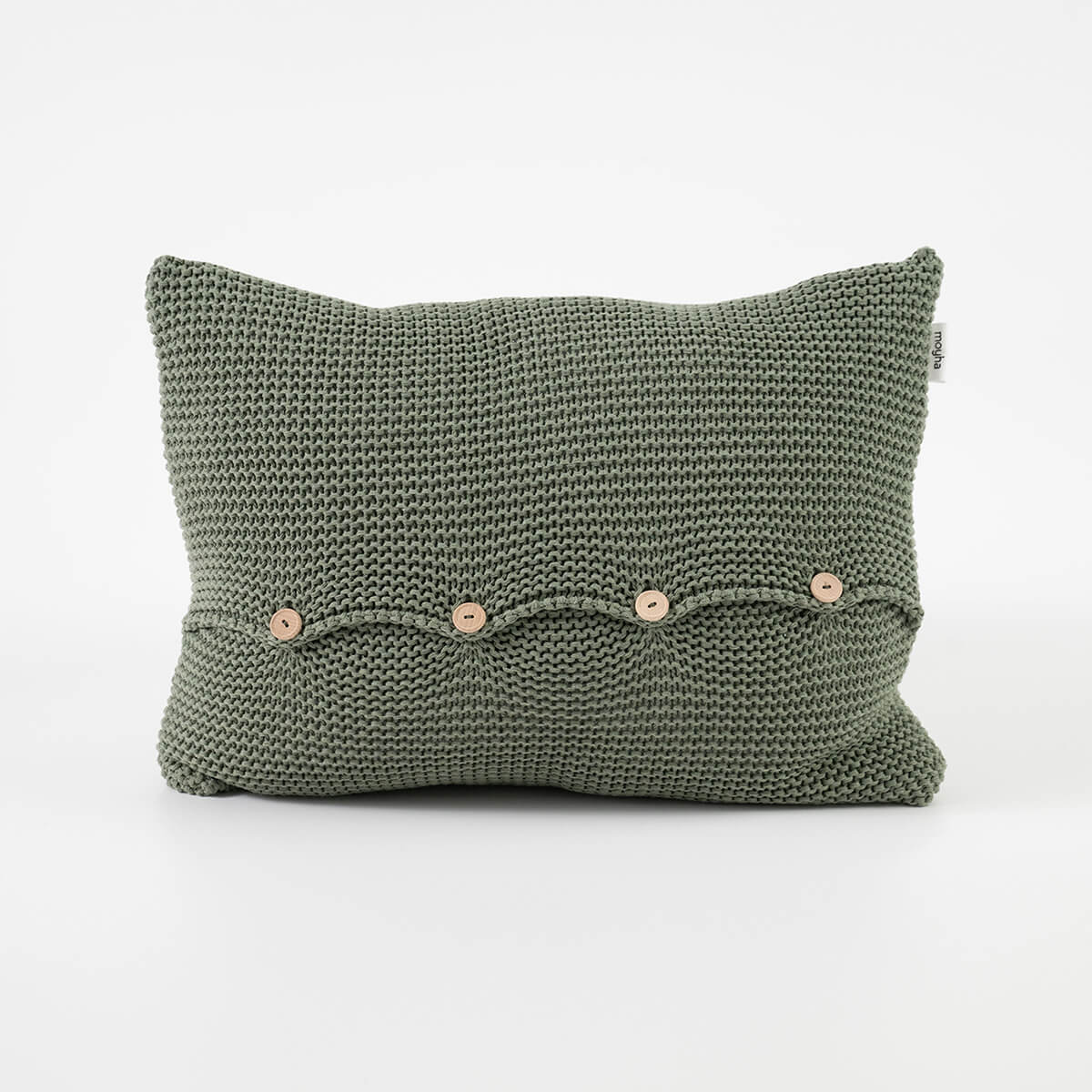 Poszewka Z GUZIKAMI w odcieniu oliwkowym to nasza nowość! Tak pokochaliście OLIWKOWĄ ZIELEŃ w naszej kolekcji, że postanowiłyśmy dodać również ten model do całego zestawu. Ta poszewka dekoracyjna ma prosty, mięsisty wzór i wykonana jest z mieszanki bawełnianej przędzy całkowicie pochodzącej z recyklingu. Ozdobą poszewki są guziki zrobione z drewna bukowego. Można je, wedle uznania, wyeksponować lub odwrócić chowając do tyłu. Poduszka wygląda najpiękniej w zestawie, kiedy łączymy ją z pledem, narzutą LENIWY PORANEK lub innymi poduszkami z tej samej kolekcji. Tekstylia z tej kolekcji nadają się również do stylizacji w stylu BOHO.