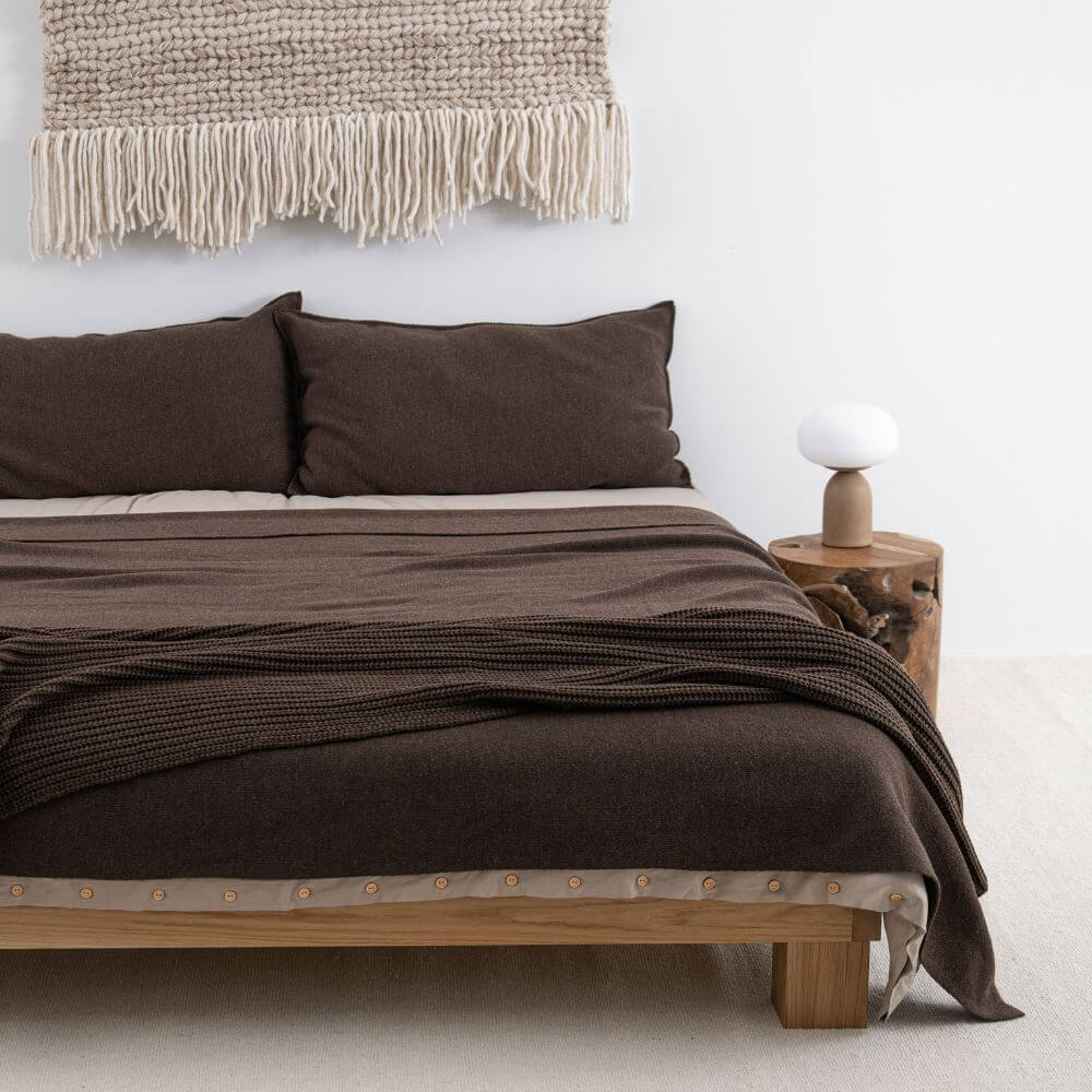 Kolekcja Dwa Sploty łączy w sobie dwa rodzaje wykończenia – gładki, minimalistyczny oraz ozdobny, bardziej wyrazisty. Dzięki temu pledy, narzuty i poduszki z tej kolekcji można ze sobą swobodnie zestawiać, tworząc harmonijną, a jednocześnie wielowymiarową aranżację. Zestawienie dwóch faktur buduje ciekawy efekt, w którym minimalizm spotyka się z dekoracyjną formą.