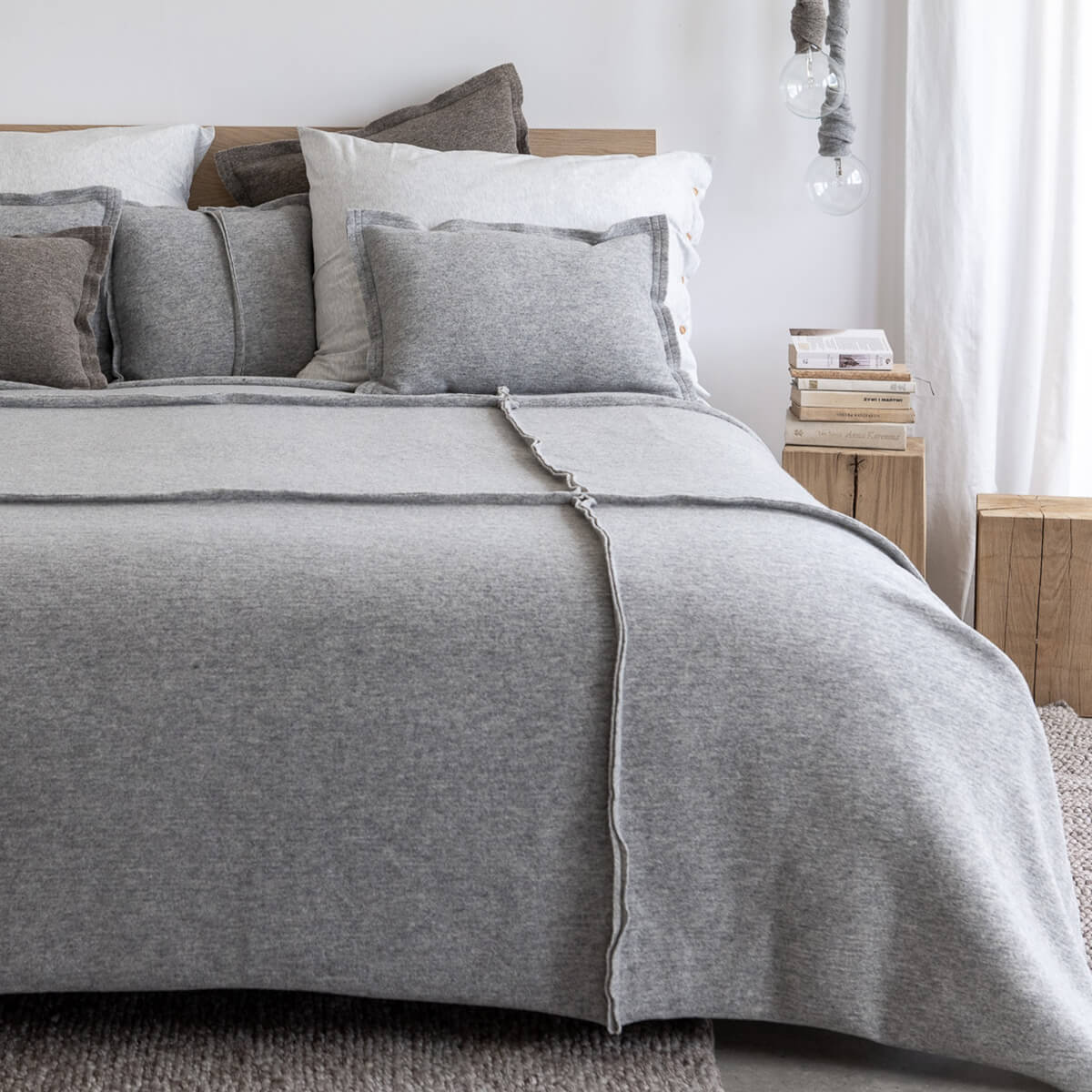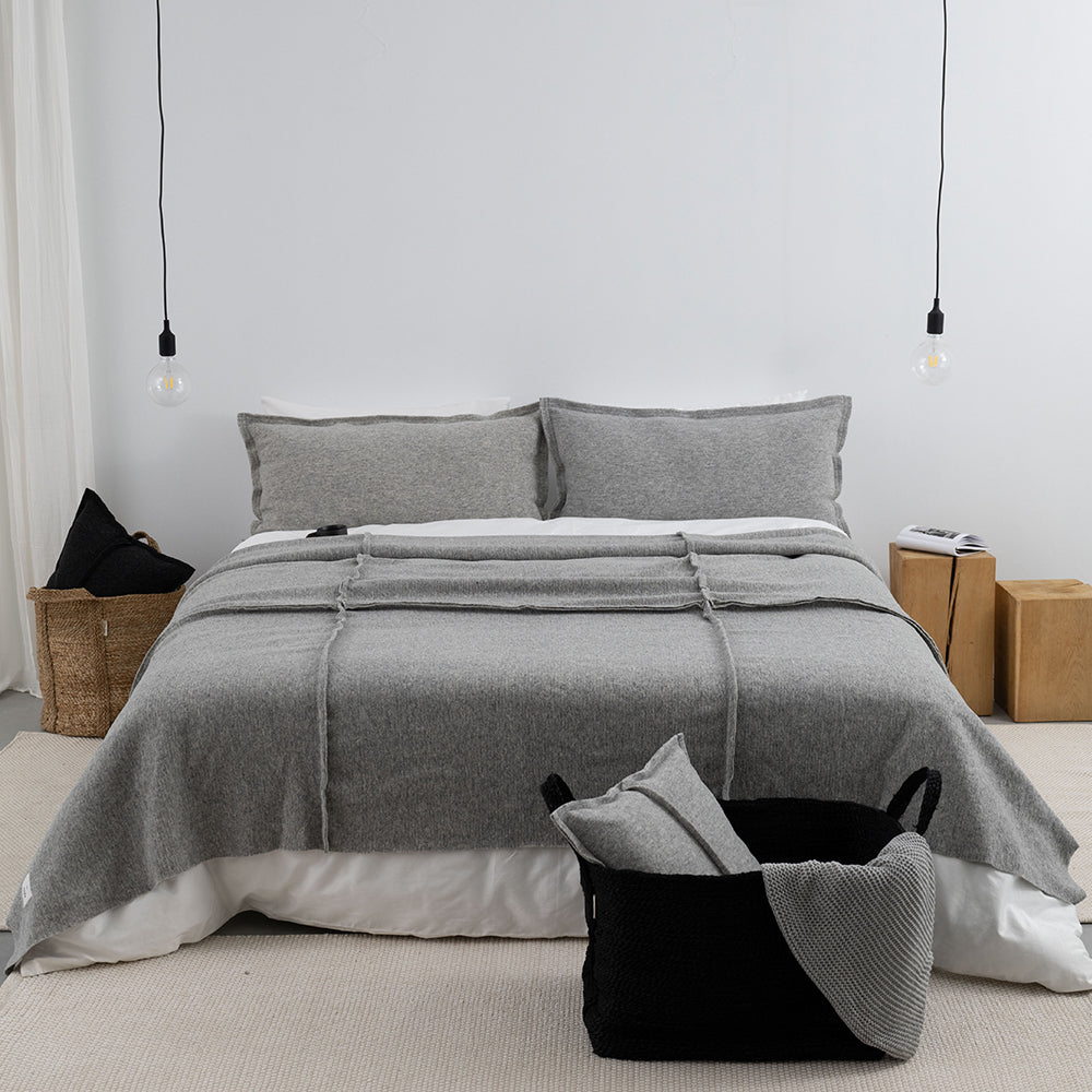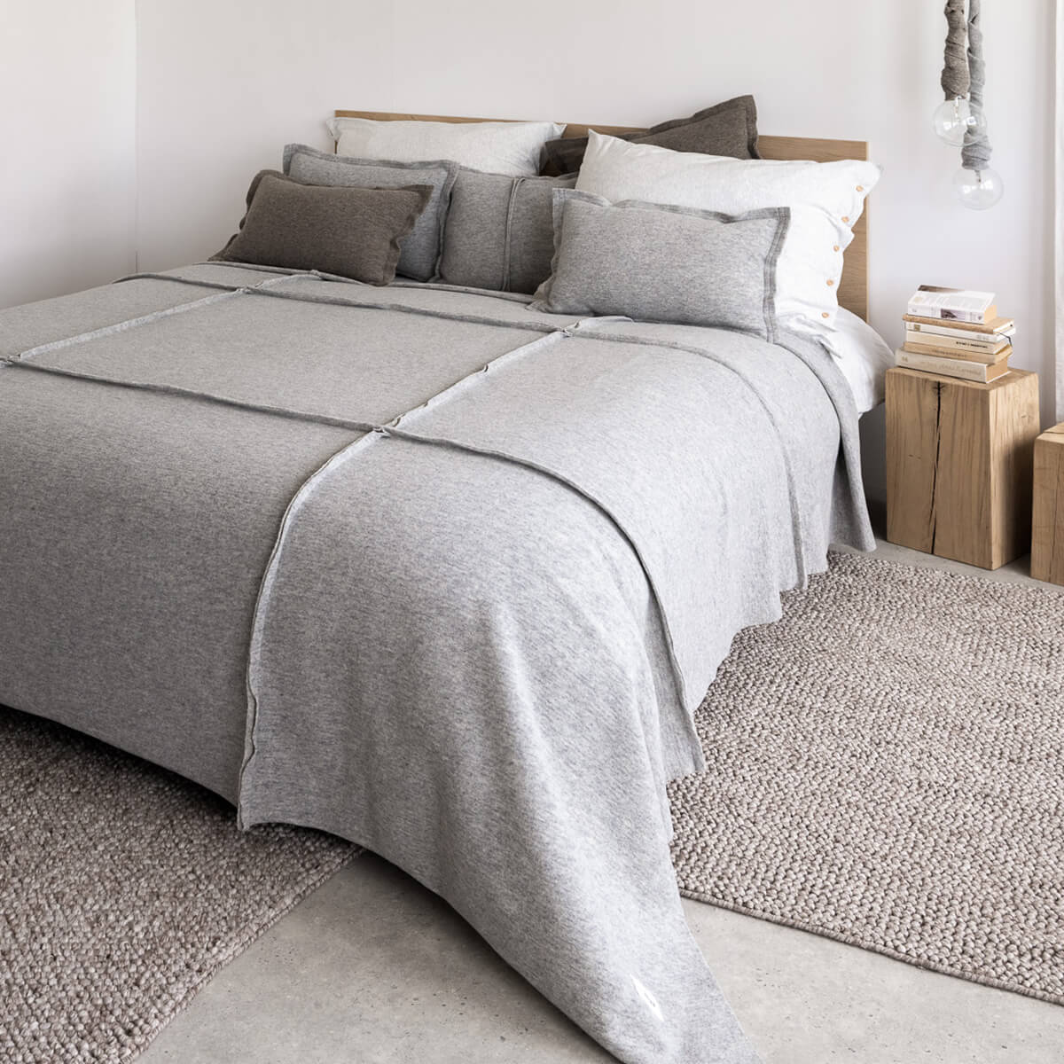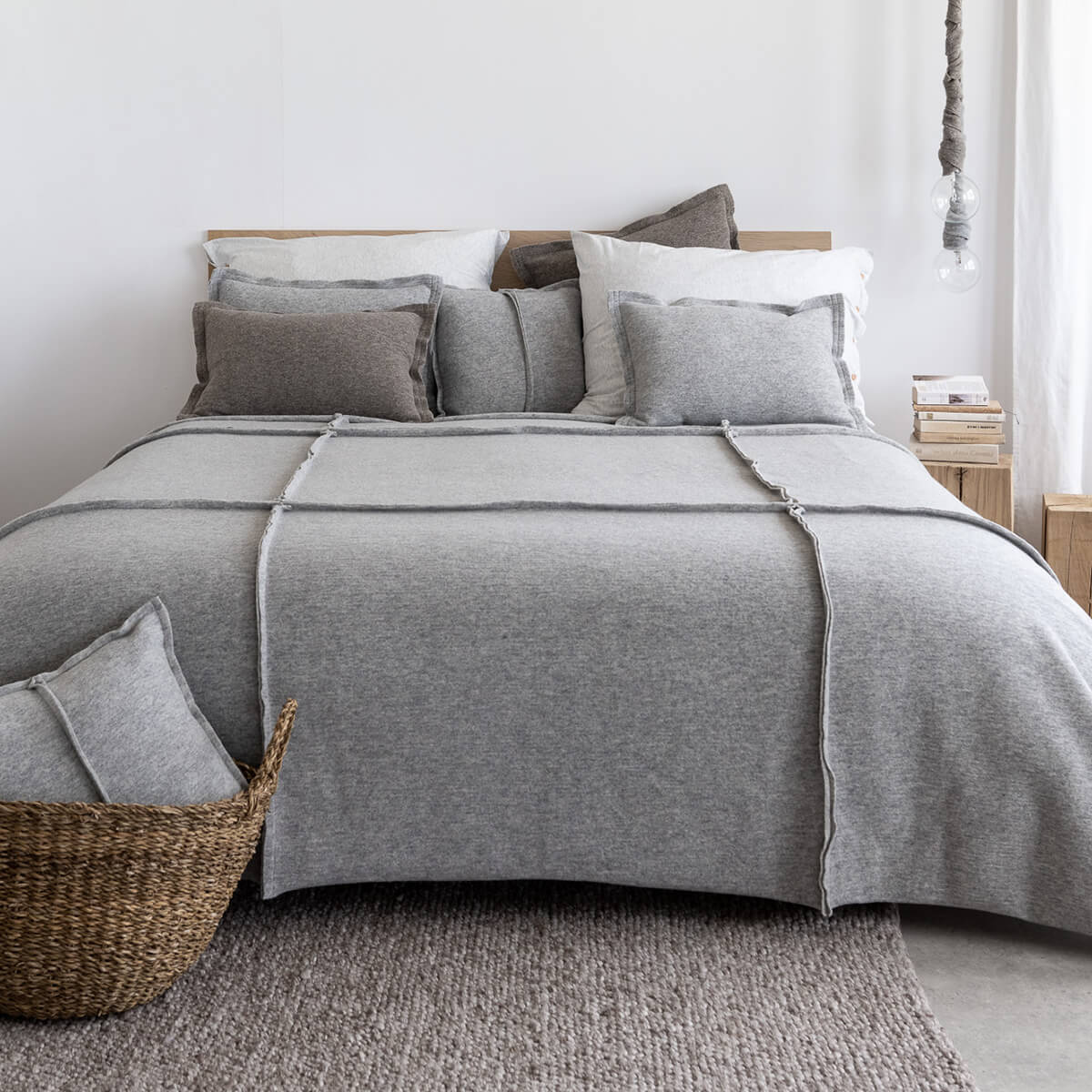 Narzuta z mięsistej, wełnianej dzianiny w kolorze popielatym, wyjątkowego charakteru dodają jej surowo wykończone szwy. Prosty design powoduje, że ta narzuta na łóżko nadaje się do każdego wnętrza, nie przytłaczając jego charakteru swoim wyglądem.