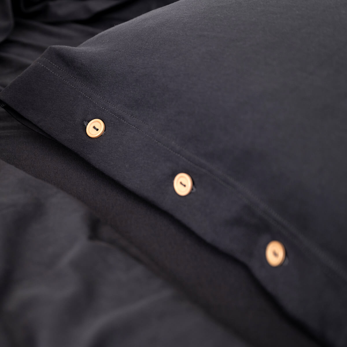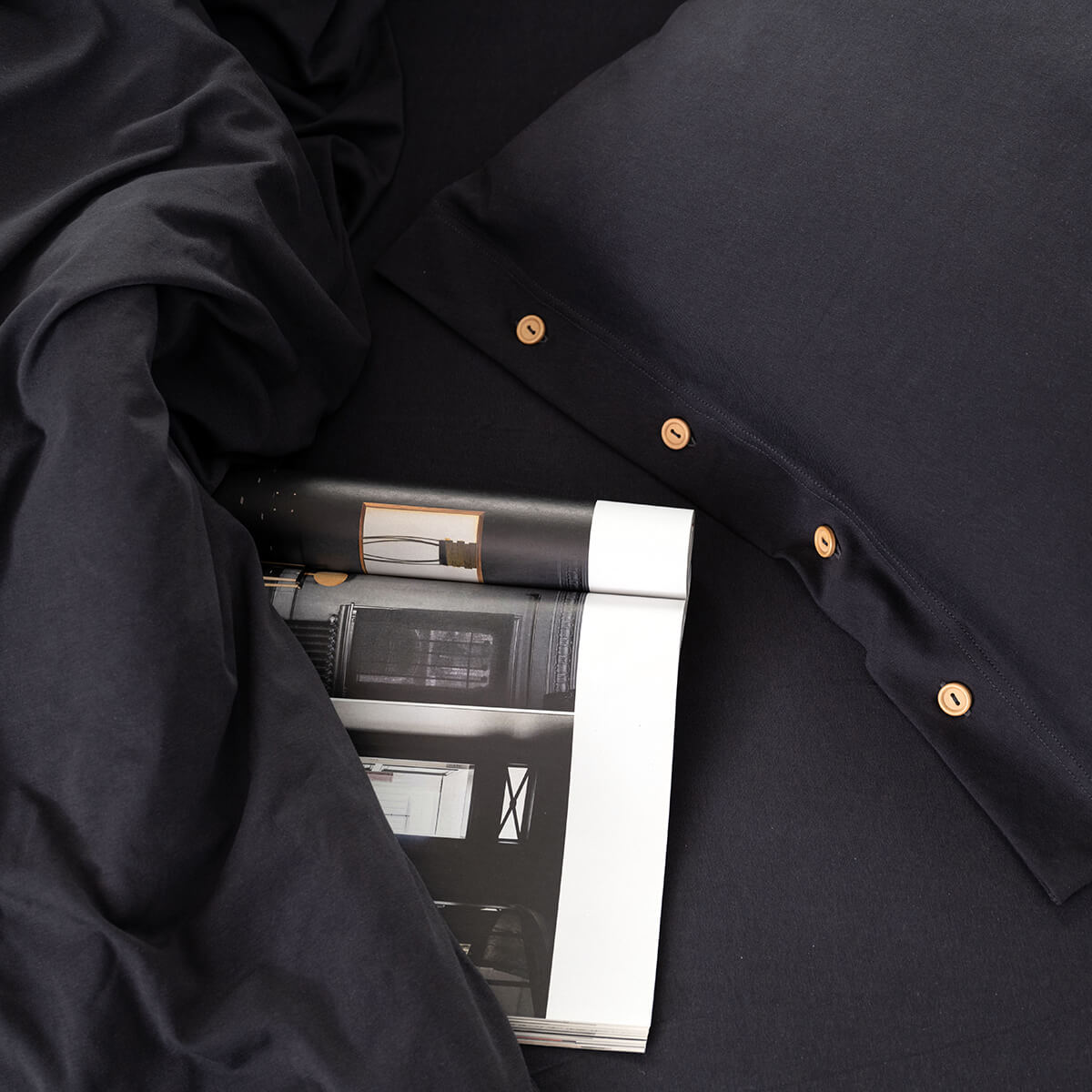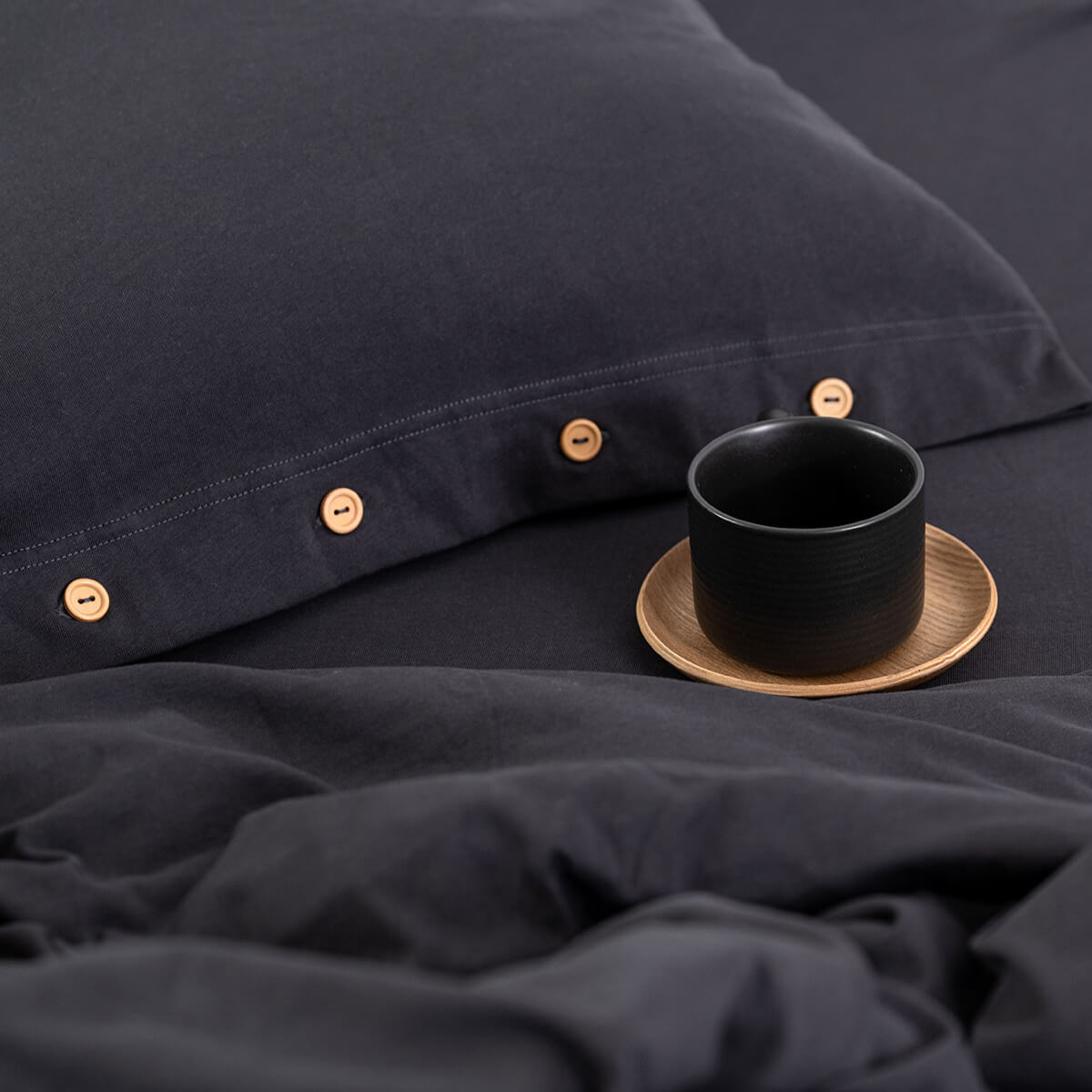 Pościel uszyta z wyjątkowej miękkiej i delikatnej dzianiny w odcieniu antracytowego melanżu. Naturalny jej skład powoduje, że skóra oddycha, a pościel jest przyjemna w dotyku jak twój ukochany t-shirt. Poszewka na poduszkę i kołdrę zapinane są na drewniane guziki. Całość nie tylko jest bajecznie przyjemna, ale również i piękna. Pokochasz ją od pierwszego dotyku. Dopasuj swój rozmiar pościeli spośród dostępnych wersji.