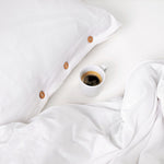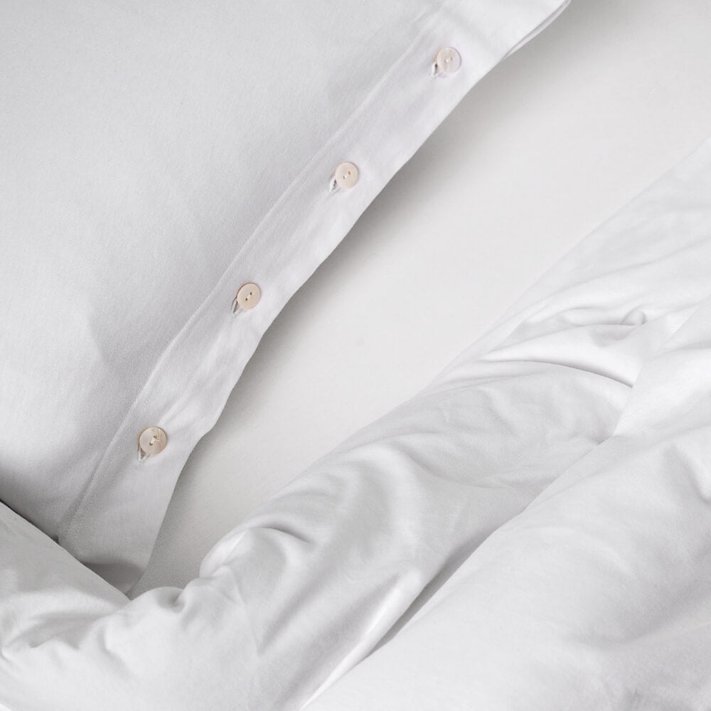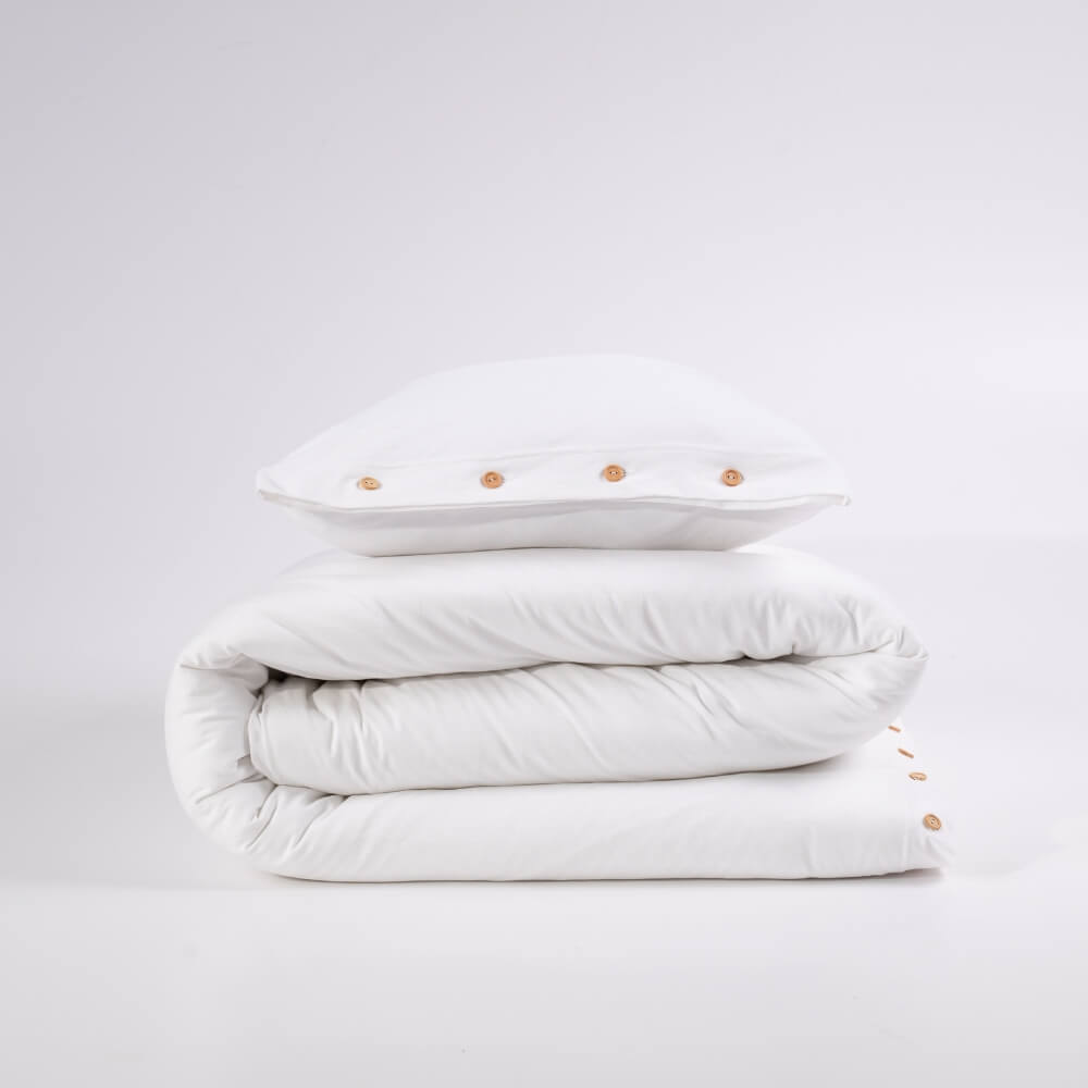 Pościel uszyta jest z wyjątkowej miękkiej i delikatnej dzianiny w śnieżnobiałym kolorze. Naturalny jej skład powoduje, że skóra oddycha, a pościel jest przyjemna w dotyku jak twój ukochany t-shirt. Poszewka na poduszkę i kołdrę zapinane są na drewniane lub perłowe guziki. Całość nie tylko jest bajecznie przyjemna, ale również i piękna. Pokochasz ją od pierwszego dotyku. Dopasuj swój rozmiar pościeli spośród dostępnych wersji.