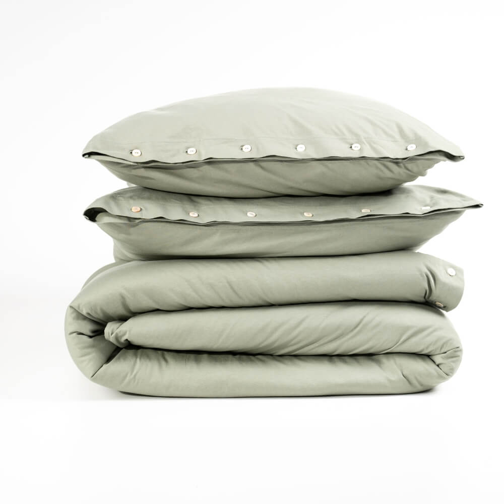 Pościel uszyta jest z wyjątkowej miękkiej i delikatnej dzianiny jersey w kolorze oliwkowym. Naturalny jej skład powoduje, że skóra oddycha, a pościel jest przyjemna w dotyku jak twój ukochany t-shirt. Poszewki na poduszkę i kołdrę zapinane są guziki z masy perłowej, delikatne i stonowane, więc będą pasować niezależnie od stylistyki wnętrza. Całość nie tylko jest bajecznie przyjemna, ale również i piękna. Pokochasz ją od pierwszego dotyku. Dopasuj swój rozmiar pościeli spośród dostępnych wersji.