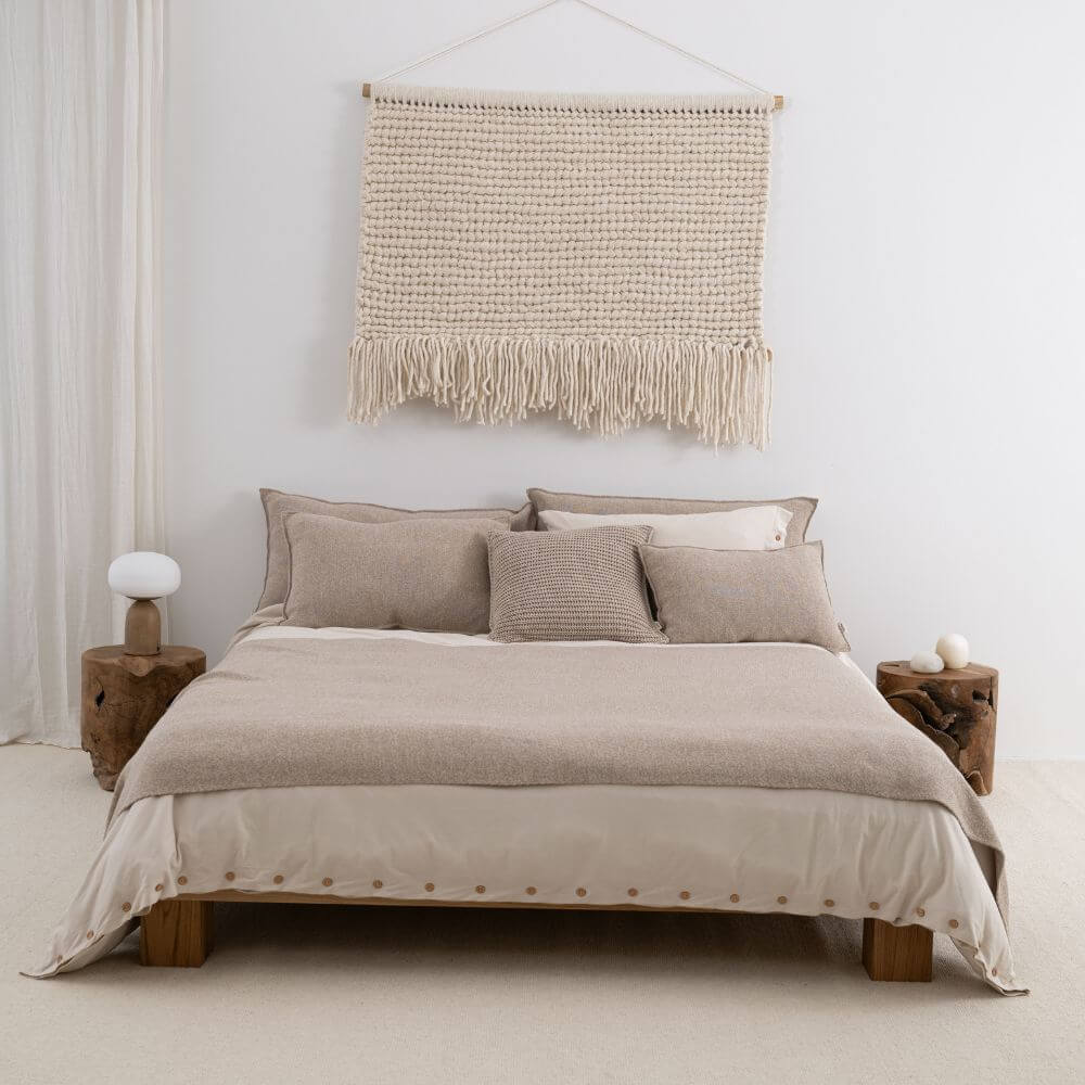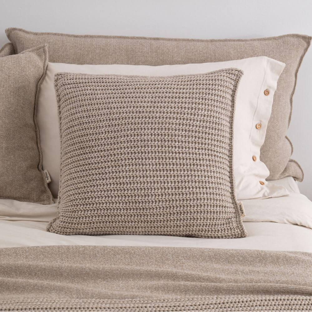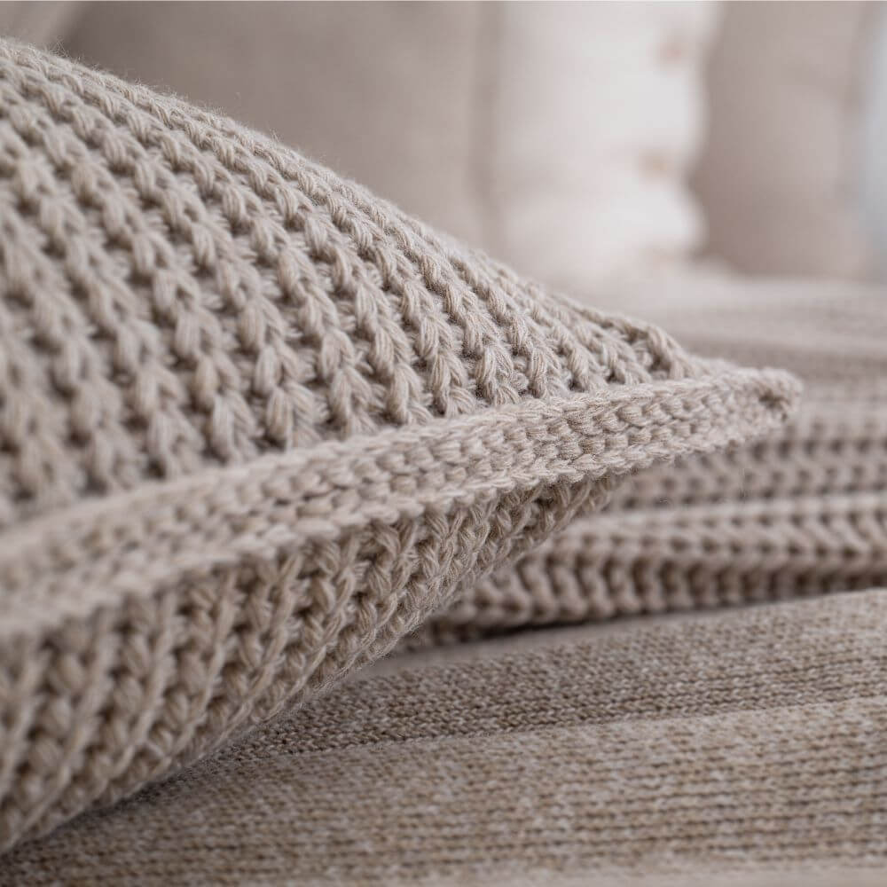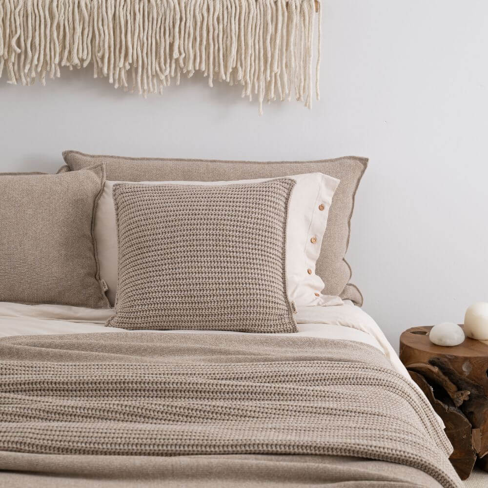 Poszewka w rozmiarze 50×50 cm została zaprojektowana tak, aby tworzyć idealny duet z pledem w tym samym splocie lub gładką narzutą na łóżko, tworząc spójną i elegancką kompozycję. Dzięki swojej dekoracyjnej strukturze świetnie komponuje się również z gładkimi tekstyliami z tej samej kolekcji. Zestawienie poszewki z wyrazistą strukturą splotu i gładkich produktów pozwala budować wielowymiarową aranżację, w której minimalizm spotyka się z dekoracyjną fakturą.