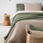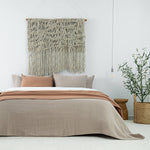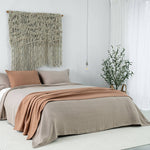 The cotton bedspread in a cool beige color is available in three sizes. The smallest size of the bedspread, 150x240 cm, is perfect both as a blanket and for covering the bed in the so-called "hotel style". In this version, we cover only the lower half of the bed, leaving the headboard and decorative pillows uncovered. This solution looks attractive and allows for a beautiful display of the entire styling of the bed. The bedspread 220x240 and the bedspread 260x240 cm are suitable for covering the entire bed with larger dimensions of 160x200, 180x200 or 200x200 cm.