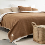 This bedroom throw is a light, warm brown, which we've dubbed "hazelnut." The color is very natural, beautifully pairing with white, beige, wood, and dark accessories. This herringbone bedspread is a great option for true lovers of warm wool. The benefits of wool products certainly don't need to be overstated, but it's worth emphasizing its natural and warm character, especially appreciated during the colder months. So if you enjoy spending time in a made bed and happen to take an afternoon nap, a wool throw will also make a wonderful and warm blanket. 100% wool and a beautiful herringbone pattern are a pure classic appreciated by connoisseurs, and they won't go out of style for long. The throw has a popular size of 220x240 cm and fits beds with a 160x200 cm or 180x200 cm mattress. Match it with white or beige, single-color bedding, a few decorative pillowcases from the same collection, and your bedroom will be ready for winter!