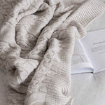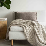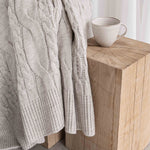 This beautifully patterned throw is the most decorative piece in our collection. The combination of various weaves and thick, full-bodied yarn with a touch of wool captivated us with its beauty. The delicate, light beige gives it an exceptionally subtle feel, making it a sight to behold. The throw is incredibly warm and cozy; we created it specifically for those who need a cozy wrap in the autumn or winter.