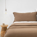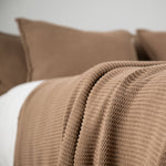 The Long Morning pillowcase in a light brown shade has a simple, chunky pattern and is made from a cotton blend yarn that's entirely recycled. This is an important aspect of choosing yarn for this collection. This extra-long decorative pillowcase is our new addition! We've introduced this size to our range of decorative pillowcases and pillow fillings for those of you who don't necessarily enjoy having a "huge" number of pillows on your bed. Either you have nothing to do with them when you want to lie down, or you simply don't have time for daily bed styling. Pragmatism prevails, and we choose a slightly more modest option. The Long Morning pillowcase is the best solution in such cases. This size allows you to fill the entire width of a 160 or 180 cm mattress with two pillows. The 90x50cm pillowcases look beautiful next to each other. However, if you want to add something extra, choose a matching pillowcase from the same collection.