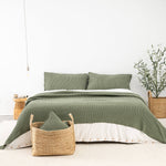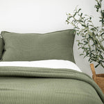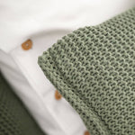 The olive green LONG MORNING pillowcase has a simple, chunky pattern and is made from a 100% recycled cotton blend. This is an important aspect of our yarn selection for this collection. This extra-long decorative pillowcase is our new addition ! We've introduced this size to our range of decorative pillowcases and pillow fillings for those of you who don't necessarily enjoy having a "huge" number of pillows on your bed. Either you have nothing to do with them when you want to lie down, or you simply don't have time for daily bed styling. Pragmatism prevails, and we choose a more modest option. The LONG MORNING pillowcase is the best solution in this case. This size allows you to fill the entire width of a 160 or 180 cm mattress with two pillows. The 90x50cm pillowcases look beautiful next to each other. However, if you want to add something more, if you want to add something more, choose the other pillowcases in the same color or another one from the collection.