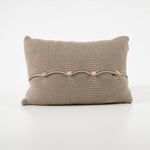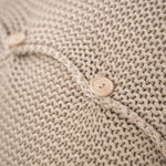 The light beige button cushion cover has a simple, bold pattern and is made from a 100% recycled cotton blend. This was an important aspect of our yarn selection for this collection. The cushion cover is adorned with beechwood buttons. These buttons can be displayed or reversed to hide them. The cushion looks most beautiful when paired with a throw, bedspread, or other cushions from the same collection. The beige and light gray colors complement natural interiors and are also suitable for boho-style styling.