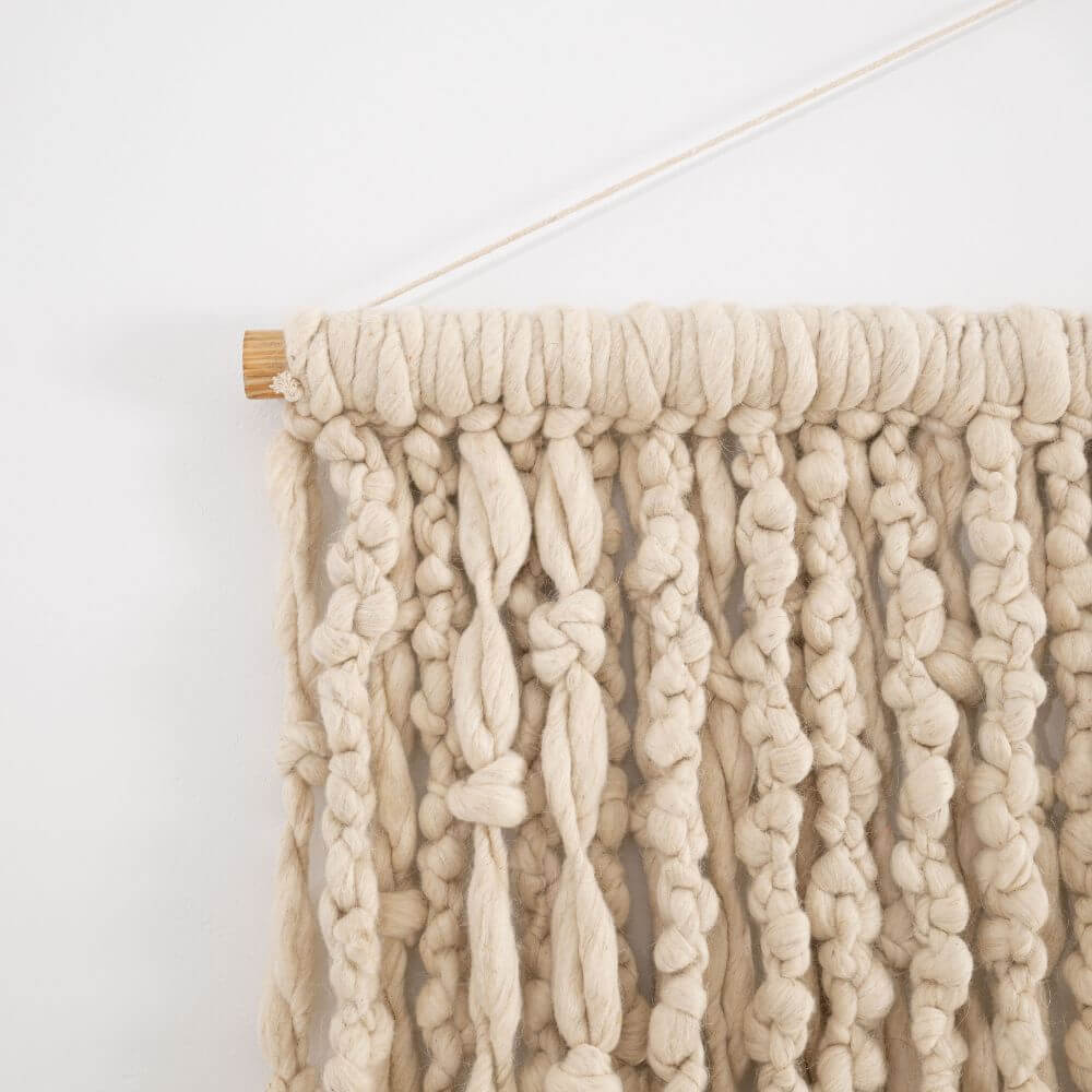 Made of natural wool, it captivates with its subtle, bright colors and artisanal finish. Hung on a wooden rod, it looks harmonious and adds a striking accent to the wall – a perfect replacement for paintings or other wall decorations, adding a cozy touch to any space. The 120x90cm size is perfect for hanging above a bed in a bedroom. Each piece is handmade, making it unique and unrepeatable – like a small work of art created with a love of craftsmanship and simple, high-quality materials.