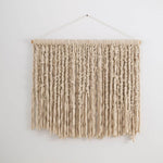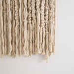A wall kilim with woolen fringe is a uniquely decorative, handmade piece that catches the eye with its soft form and rich texture. The densely arranged, free-falling fringes create a light, airy effect, while the natural color of the undyed wool lends a cozy, warm, textile feel to any interior.