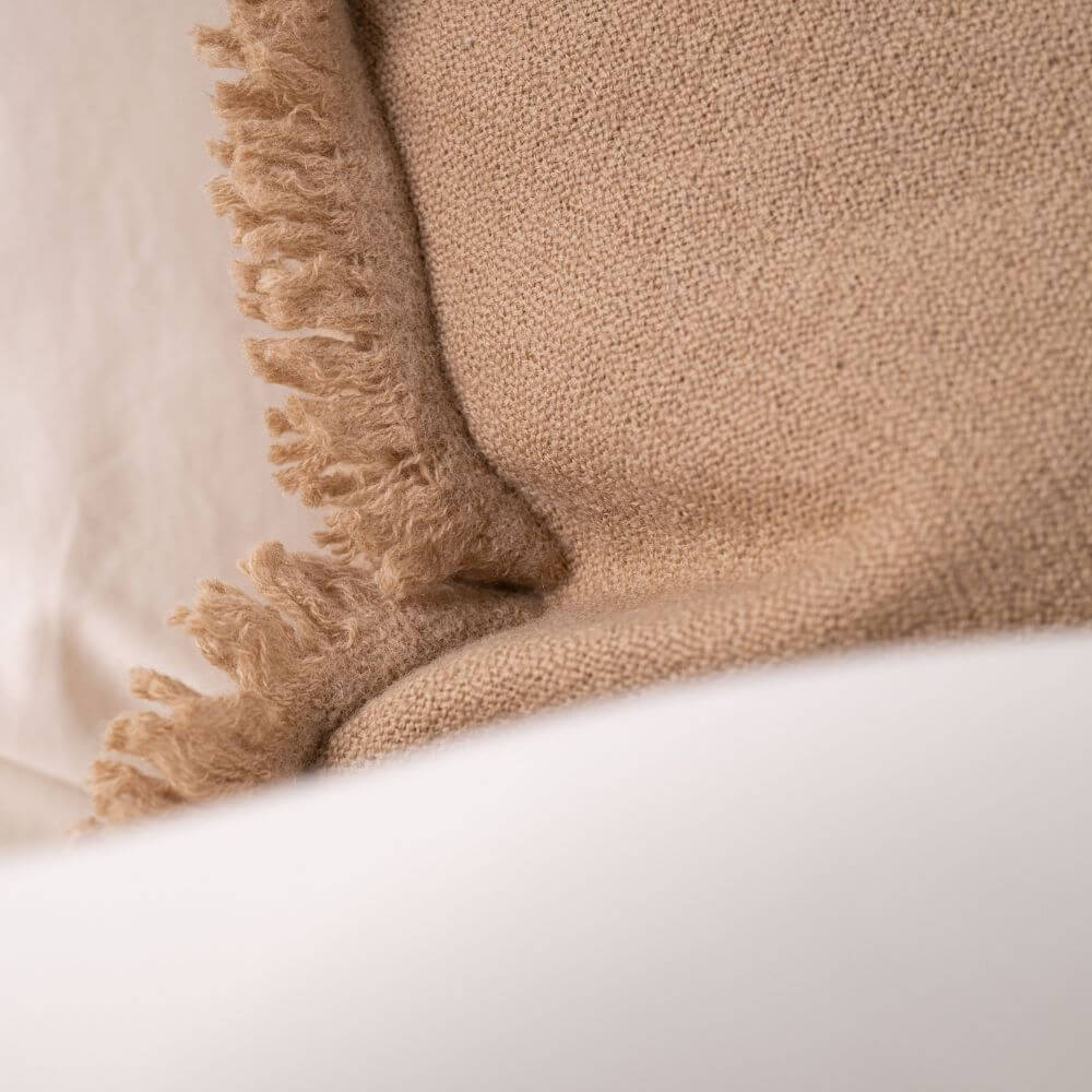 This 100% wool decorative pillowcase comes in a beautiful shade of light brown, with a delicately crimped texture and decorative fringe trim on the short sides. And if you like decorative pillows paired with a warm wool blanket, you can create a truly winter-ready set. We also offer a light brown throw with a decorative border in two sizes. You can also mix and match the different colors and sizes of decorative pillows, throws, and bedspreads from the wool collection with a decorative border to create a warm and natural look for your bedroom during the colder months. 100% wool guarantees a truly cozy winter in your home!