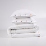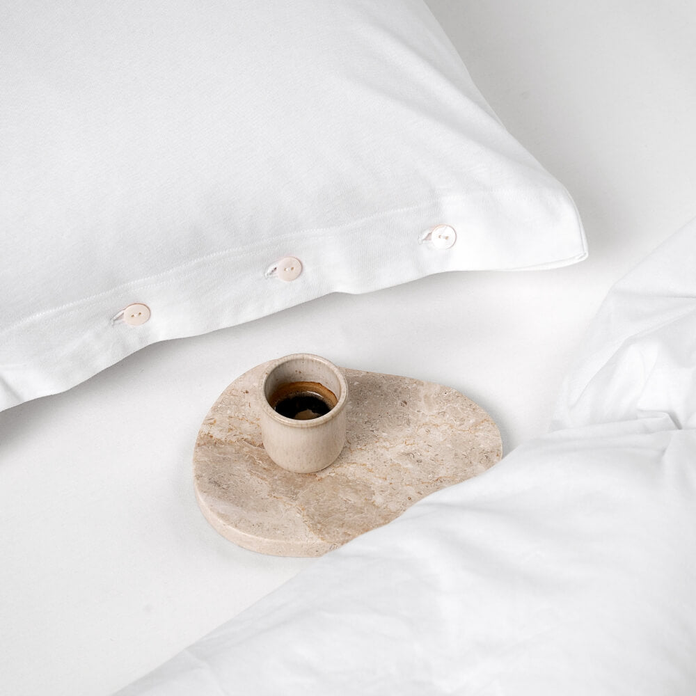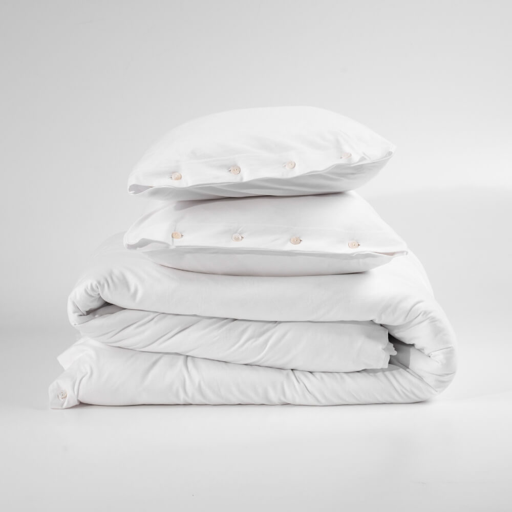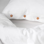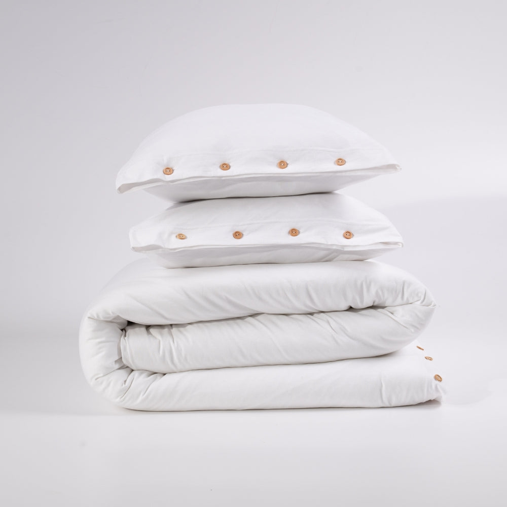Pościel uszyta z wyjątkowo miękkiej i delikatnej dzianiny w śnieżnobiałym kolorze. Naturalny jej skład powoduje, że skóra oddycha, a pościel jest przyjemna w dotyku jak twój ukochany t-shirt. Poszewki na poduszkę i kołdrę zapinane są na drewniane lub perłowe guziki. Całość nie tylko jest bajecznie przyjemna, ale również i piękna. Pokochasz ją od pierwszego dotyku. Dopasuj swój rozmiar pościeli spośród dostępnych wersji.